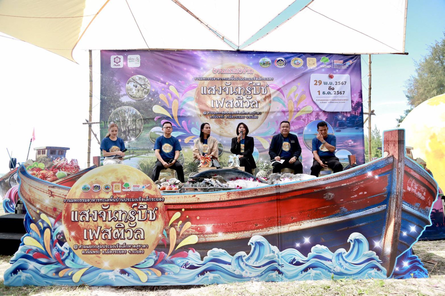 วันที่ 21 พ.ย.67 เวลา 11.00 น.ผู้สื่อข่าวรายงาน ว่า ที่บริเวณสามแยกประมงเรือเล็กหาดสุชาดา ต.เนินพระ อ.เมือง จ.ระยอง น.ส.สลารีวรรณ ทัพทวี รอง ผวจ.ระยอง นายพงษ์ศักดิ์ คงคารัตน์ ปลัดอำเภอเมืองระยอง นางประภา ปานนิตยกุล พัฒนาการ จ.ระยอง นายบุญธรรม ใจกล้า นายกเทศมนตรีตำบลเนินพระ และนายภุชงค์ สฤษดีชัยกุล ผจก. สำนักงานกองทุนพัฒนาไฟฟ้าเขตนิคมอุตสาหกรรมมาบตาพุด จ.ระยอง ร่วมแถลงข่าวการจัดงานมหกรรมอาหารทะเลพื้นบ้านประมงเรือเล็กระยอง 'แสงจันทร์บีชเฟสติวัล'