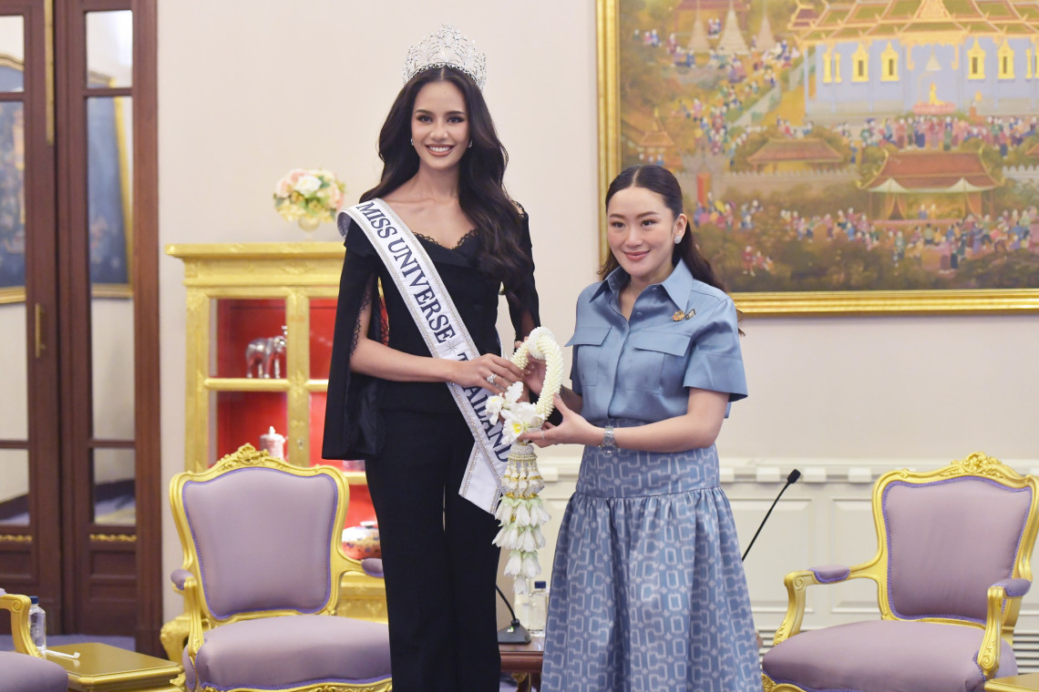 เมื่อเวลา 11.45 น. วันที่ 22 พ.ย. 67 ที่ห้องสีม่วง ตึกไทยคู่ฟ้า ทำเนียบรัฐบาล นางปิยาภรณ์ แสนโกศิก กรรมการผู้จัดการบริษัท ทีพีเอ็น โกลบอล จำกัด นำ น.ส.สุชาตา ช่วงศรี (โอปอล) รองมิสยูนิเวิร์ส 2024 เข้าเยี่ยมคารวะ น.ส.แพทองธาร ชินวัตร นายกรัฐมนตรี พร้อมมอบพวงมาลัยให้นายกฯ โดยนายกฯ กล่าวว่า ขอแสดงความยินดีและดีใจด้วย ปีนี้คนไทยติด 1 ใน 3 อีกแล้วเก่งมาก พร้อมชม น.ส.สุชาตา สวย ขณะที่น.ส.สุชาตา ได้กล่าวชมนายกฯเช่นกันว่า ตัวจริงนายกฯสวยกว่าในรูป นายกฯจึงกล่าวขอบคุณและกล่าวติดตลกว่า “น้องพูดแบบนี้ไม่ได้นะ ทำให้พี่เครียด” พร้อมสอบถามเรื่องการใส่ผ้าไทย ซึ่งน.ส.สุชาตา ระบุว่า ตนชอบใส่ผ้าไทย ตอนไปอยู่เวทีการประกวดได้รับการชื่นชมจากต่างชาติมากเรื่องการใส่ผ้าไทย
