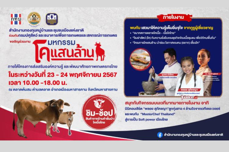สำนักงานกองทุนหมู่บ้านและชุมชนเมืองแห่งชาติ  ร่วมกับกรมปศุสัตว์  และ ธนาคารเพื่อการเกษตรและสหกรณ์การเกษตร (ธ.ก.ส.) ขอเชิญเกษตรกรและผู้สนใจทุกท่าน ร่วมงาน มหกรรม “โคแสนล้าน” ภายใต้โครงการส่งเสริมองค์ความรู้ และพัฒนาศักยภาพเกษตรกรไทย ระหว่างวันเสาร์ที่ 23 และอาทิตย์ที่ 24 พฤศจิกายน 2567 ตั้งแต่เวลา  10.00 -18.00 น. ณ ตลาดต้นสน ตำบลตลาด อำเภอเมืองมหาสารคาม จังหวัดมหาสารคาม