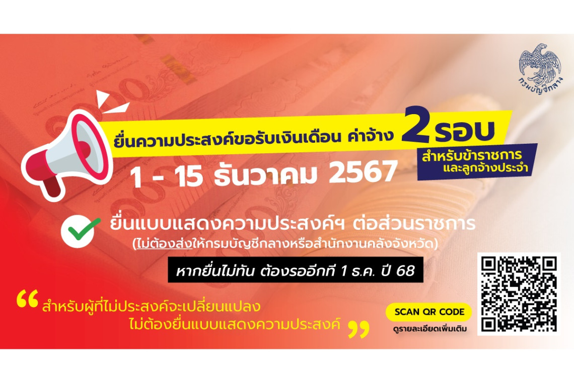 "กรมบัญชีกลาง" แจ้งข้าราชการและลูกจ้างประจำที่ประสงค์ขอรับเงินเดือน 2 รอบ ยื่นความประสงค์ภายใน 1-15 ธ.ค.67