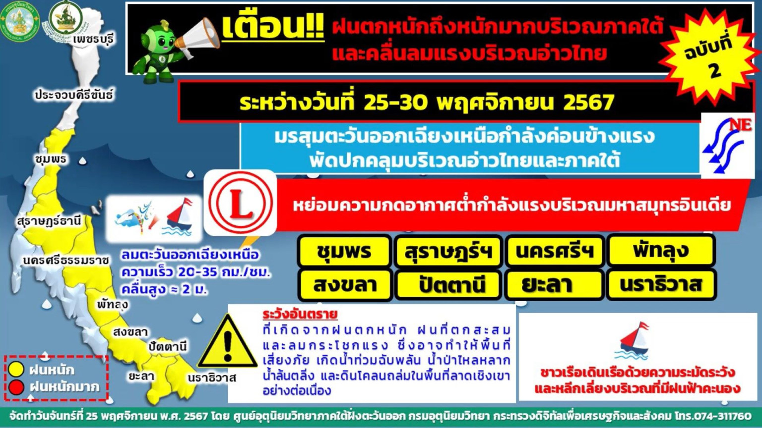 วันที่ 25 พฤศจิกายน 2567 ผู้สื่อข่าวรายงาน ว่า ศูนย์อุตุนิยมวิทยาภาคใต้ฝั่งตะวันออก ประกาศฉบับที่ 2 (59/2567) เรื่อง ฝนตกหนักถึงหนักมากบริเวณภาคใต้ฝั่งตะวันออกและคลื่นลมแรงบริเวณอ่าวไทย (ระหว่างวันที่ 25-30 พฤศจิกายน 2567)มรสุมตะวันออกเฉียงเหนือกำลังค่อนข้างแรงยังคงพัดปกคลุมอ่าวไทยและภาคใต้ประกอบกับมีหย่อม ความกดอากาศต่ำกำลังแรงบริเวณมหาสมุทรอินเดีย และในช่วงวันที่ 27-30 พฤศจิกายน 2567 บริเวณความกด อากาศสูงหรือมวลอากาศเย็นกำลังปานกลางถึงค่อนข้างแรงระลอกใหม่จากประเทศจีนจะแผ่เสริมลงมาปกคลุมประเทศ ไทยตอนบนและทะเลจีนใต้