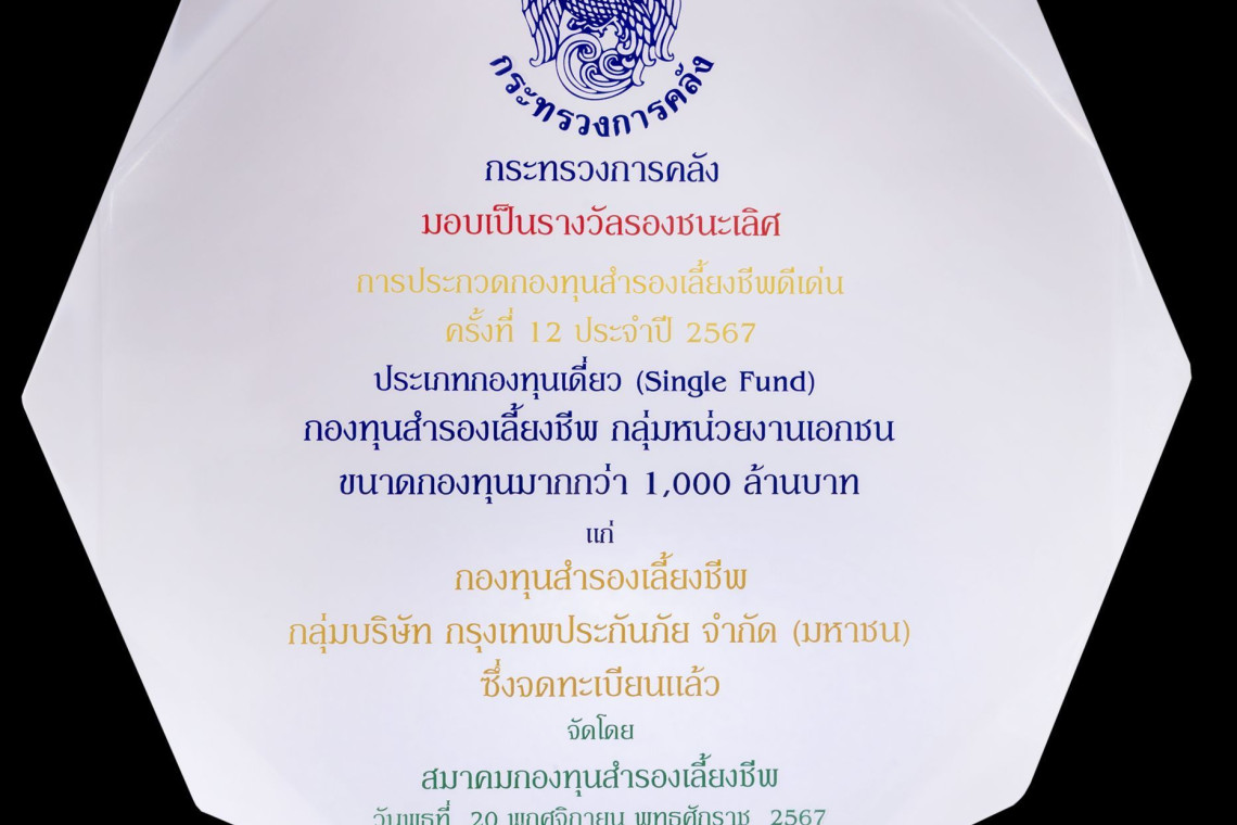 กรุงเทพประกันภัย ได้รับโล่รางวัลกระทรวงการคลัง รางวัลรองชนะเลิศ ประเภทกองทุนเดี่ยว (Single Fund) กองทุนสำรองเลี้ยงชีพ กลุ่มหน่วยงานเอกชน ขนาดกองทุนมากกว่า 1,000 ล้านบาท ในงานประกาศผลการประกวดกองทุนสำรองเลี้ยงชีพดีเด่น ครั้งที่ 12 ประจำปี 2567 จัดโดยสมาคมกองทุนสำรองเลี้ยงชีพ ณ โรงแรมแอมบาสซาเดอร์ กรุงเทพฯ เมื่อวันที่ 20 พฤศจิกายน 2567