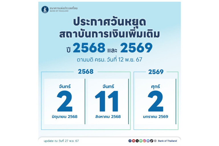 เมื่อวันที่ 27 พ.ย.67 ธนาคารแห่งประเทศไทย (ธปท.) แจ้งว่า ตามที่คณะรัฐมนตรีได้มีมติเมื่อวันที่ 12 พฤศจิกายน 2567 ให้เพิ่มวันหยุดราชการเป็นกรณีพิเศษเพื่อกระตุ้นการท่องเที่ยวและเศรษฐกิจในภาพรวมของประเทศ รวมถึงเป็นการสนับสนุนนโยบายที่จะกำหนดให้ปี 2568 เป็นปีแห่งการท่องเที่ยวและกีฬาของประเทศไทย นั้น