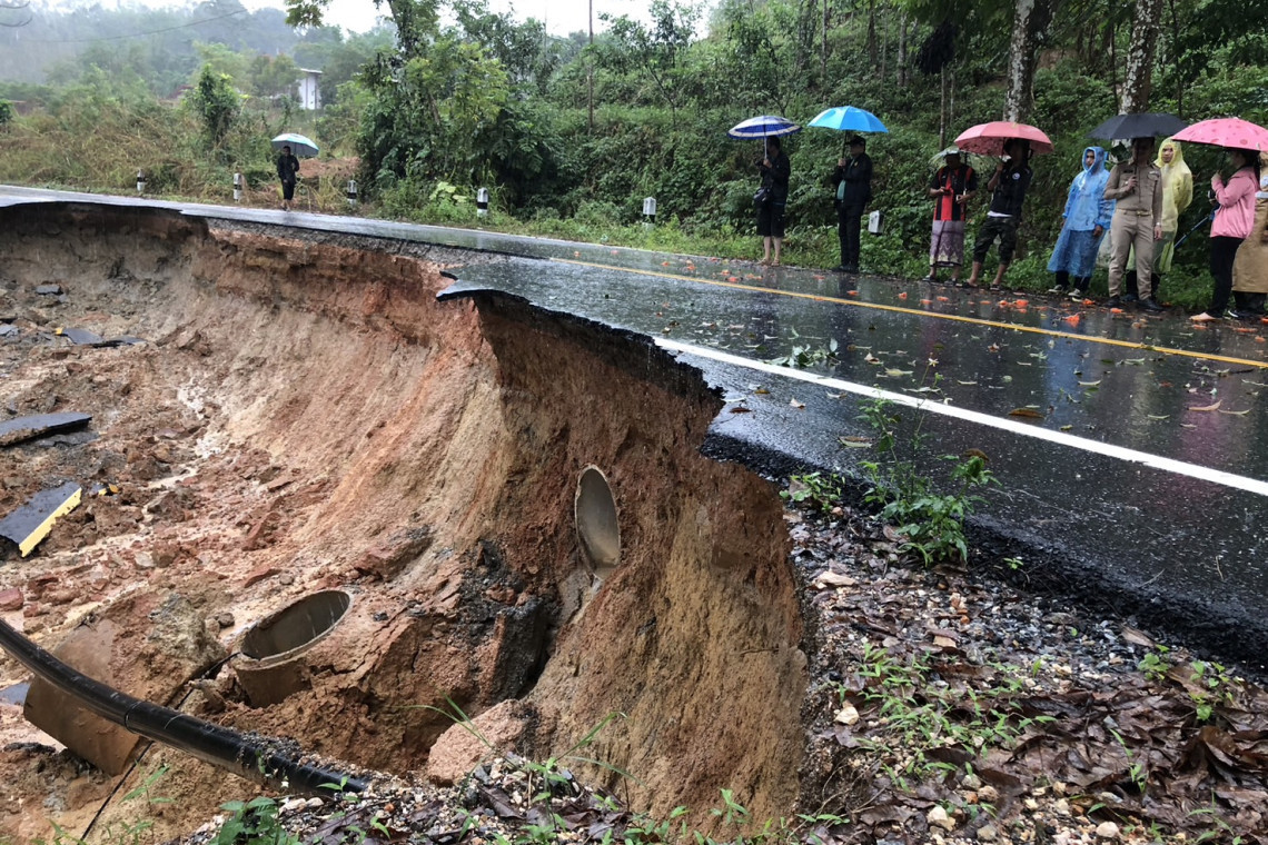 ที่ อ.เบตง จ.ยะลา ผู้สื่อข่าวรายงานว่า นายสมัคร นอระพา นายกเทศมนตรีตำบลธารน้ำทิพย์ พร้อมด้วยนายอับดุลรามัน คอแดะ กำนัน ต.ธารน้ำทิพย์ ได้ลงพื้นที่ตรวจสอบดินสไลด์ถนนทรุดตัว พื้นที่ ม.3 บ้านกาแป๊ะซาลัง ต.ธารน้ำทิพย์ ซึ่งเป็นถนนเชื่อมต่อไปยังหมู่บ้าน ม.5 บ้านราโมง ตำบลยะรม หลังเกิดดินสไลด์ถนนทรุดตัวของไหล่ทางเป็นเหวลึกกว่า 4 เมตร ทำให้พื้นถนนเกือบขาดออกจากกันเป้นแนวยาว 15 เมตร และใต้ถนนยังเกิดโพรงลึกที่พร้อมจะถล่มลงมาทุกเมื่อหากไม่มีการซ่อมแซมอย่างเร่งด่วน ส่งผลกระทบต่อการสัญจรของประชาชนและผู้ใช้เส้นทาง ทำให้รถทุกประเภทไม่สามารถผ่านได้ โดยเฉพาะรถบรรทุกและรถโดยสาร เบื้องต้นทางเจ้าหน้าที่หมวดทางหลวงยะรมได้ติดตั้งป้ายเตือน และนำแผงกั้นจราจร ไปกั้นจุดที่เกิดดินสไลด์เอาไว้ เพื่อความปลอดภัยของผู้ใช้ถนน