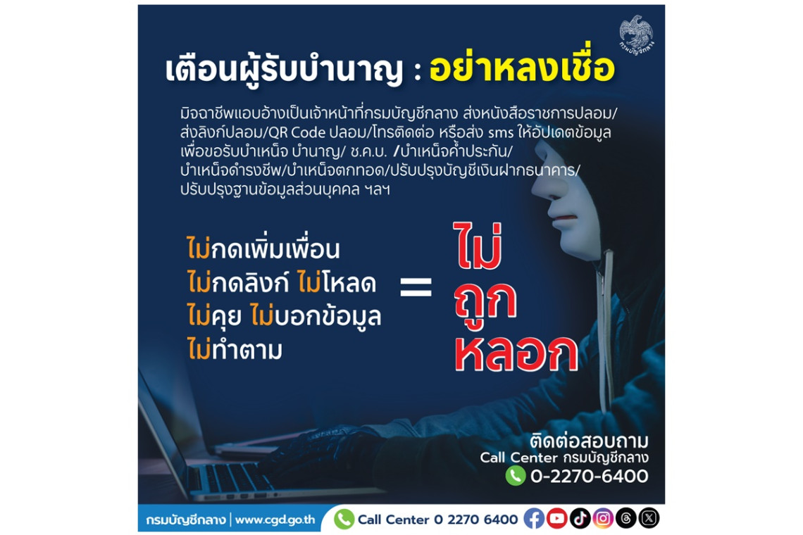 "กรมบัญชีกลาง" ห่วงผู้รับบำนาญ เตือนภัยมิจฉาชีพแอบอ้าง ย้ำไม่มีนโยบายให้เจ้าหน้าที่ติดต่อทำธุรกรรม