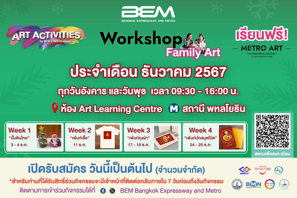 โดยกิจกรรมจะจัดขึ้นทุกวันอังคารและวันพุธตลอดเดือนธันวาคม เวลา 09.30 – 16.00 น. ณ ห้อง Art Learning Centre ที่ Metro Art MRT สถานีพหลโยธิน ผู้สนใจสามารถสมัครเข้าร่วมกิจกรรมล่วงหน้าได้ฟรี !! ตั้งแต่วันนี้เป็นต้นไป (รับจำนวนจำกัด) ผ่านทาง QR Code หรือ https://shorturl.asia/0P2rq สามารถติดตามรายละเอียดเพิ่มเติมได้ที่ Facebook (เฟซบุ๊ก) และ X (เอ็กซ์) : BEM Bangkok Expressway and Metro