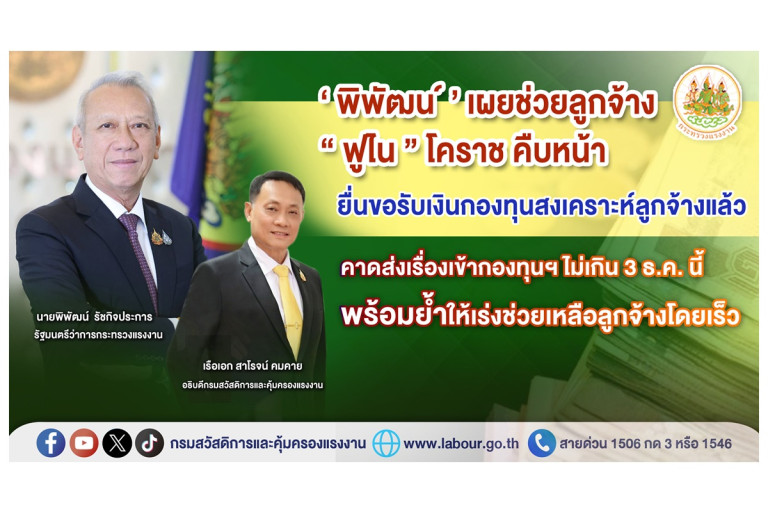 "พิพัฒน์" เผยช่วยลูกจ้าง "ฟูไนโคราช" คืบหน้า ยื่นขอรับเงินกองทุนสงเคราะห์ลูกจ้างแล้ว คาดส่งเรื่องเข้ากองทุนฯ ไม่เกิน 3 ธ.ค.นี้ พร้อมย้ำให้เร่งช่วยเหลือลูกจ้างโดยเร็ว