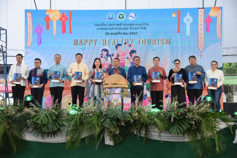 วันที่ 29 พ.ย.2567 ที่ประตูท่าแพ จ.เชียงใหม่ นายสมศักดิ์ เทพสุทิน รัฐมนตรีว่าการกระทรวงสาธารณสุข เป็นประธานพิธีเปิดงาน คิกออฟ “ท่องเที่ยว สุขภาพดี รวมพล 100 ร้าน มาตรฐานสาธารณสุข ล้านนา R1 โดยมี นายกิตติกร โล่ห์สุนทร เลขานุการรัฐมนตรีว่าการกระทรวงสาธารณสุข นายโฆสิต สุวินิจจิต นายนวธันย์ คณะที่ปรึกษารัฐมนตรีว่าการกระทรวงสาธารณสุข นายสราวุธ อ่อนละมัย ที่ปรึกษารัฐมนตรีช่วยว่าการกระทรวงสาธารณสุข นายมนตรี ปาน้อยนนท์ เลขานุการรัฐมนตรีช่วยว่าการกระทรวงสาธารณสุข น.ส.นัทรียา ทวีวงศ์ ปลัดกระทรวงการท่องเที่ยวและกีฬา นายศิวะ ธมิกานนท์ รองผู้ว่าราชการจังเชียงใหม่ นพ.วีรวุฒิ อิ่มสำราญ รองปลัดกระทรวงสาธารณสุข นพ.กิตติศักดิ์ อักษรวงศ์ อธิบดีกรมสุขภาพจิต นายจาตุรนต์ ภักดีวานิช อธิบดีกรมการท่องเที่ยว นพ.สราวุฒิ บุญสุข ผู้ตรวจราชการกระทรวงสาธารณสุข น.ส.ฐาปนีย์ เกียรติไพบูลย์ ผู้ว่าการการท่องเที่ยวแห่งประเทศไทย ผู้บริหารกระทรวงสาธารสุขและผู้บริหารกระทรวงสาธารณสุข เจ้าหน้าที่ที่เกี่ยวข้อง ประชาชนเข้าร่วมงาน ภายในงานมีการออกบูธแสดงสินค้าด้านสุขภาพกว่า 100 ร้าน ท่ามกลางความสนใจของนักท่องเที่ยวชาวไทยและชาวต่างประเทศ ทำให้บรรยากาศเป็นไปอย่างคึกคัก เมื่อมาถึงนายสมศักดิ์ ได้รับชมการแสดงฟ้อนรำและกลองสบัดชัยที่มาให้การต้อนรับ จากนั้นได้ทำพิธีเปิดงานพร้อมมอบป้ายและเกียรติบัตรรวมพล 100 ร้านมาตรฐานคุณภาพล้านนา R1 ให้กับผู้ประกอบการ ก่อนที่จะเดินเยี่ยมชมบูธด้านสุขภาพ ร้านค้า อาหาร โรงแรม สปา เวลเนส ที่ผ่านเกณฑ์มาตรฐานของกระทรวงสาธารณสุข