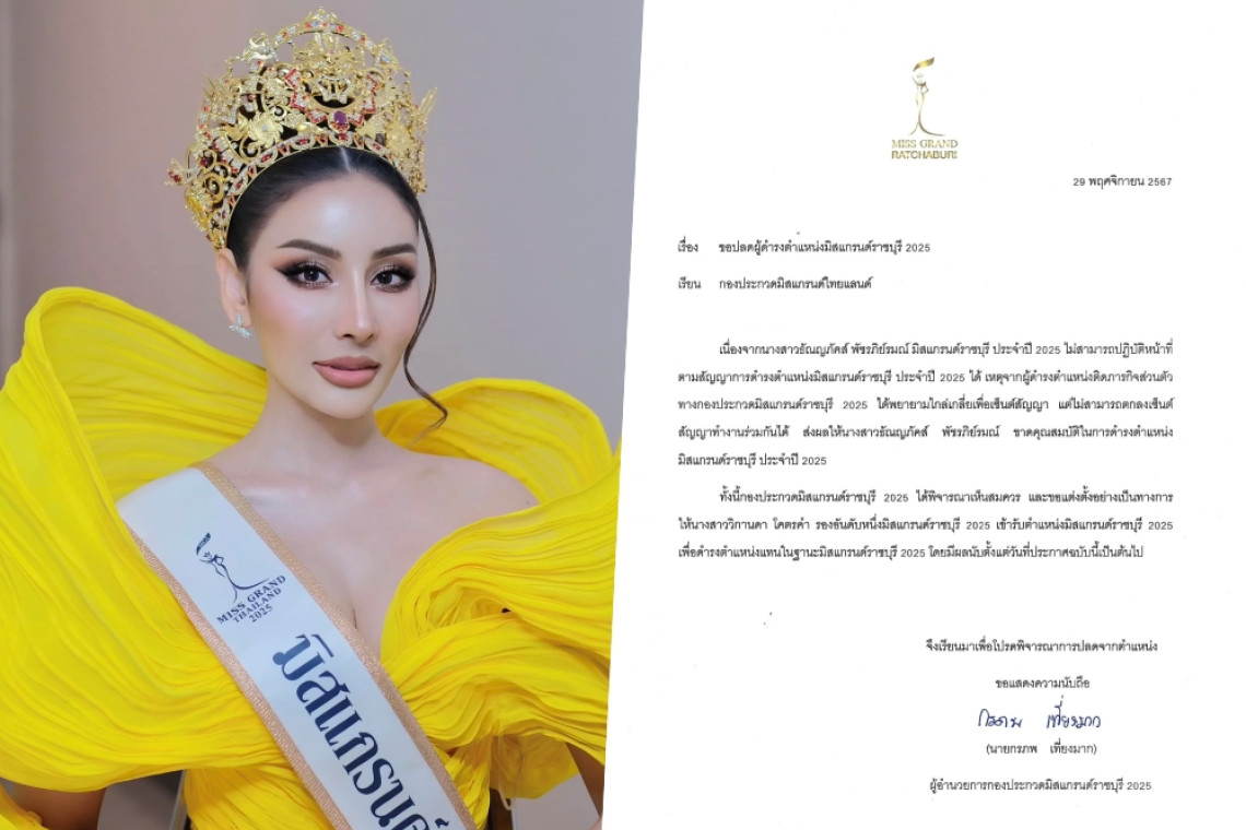 ทำเอาวงการนางงามสะเทือนอีกครั้ง เมื่อวันนี้ (29 พ.ย.67) กองประกวด ปลดมิสแกรนก์ราชบุรี 2025 ออกประกาศผ่าน เพจ มิสแกรนด์ราชบุรี – Miss Grand Ratchaburi พร้อมเขียนแคปชั่นว่า ประกาศ จากกองประกวดมิสแกรนด์ราชบุรี 2025 เรื่อง ขอปลดตำแหน่งมิสแกรนด์ราชบุรี 2025 เนื่องจากไม่สามารถปฏิบัติหน้าที่ได้ เหตุจากติดภารกิจส่วนตัว จึงขอประกาศ ปลดตำแหน่งมิสแกรนด์ราชบุรี 2025 และขอยุติการปฏิบัติหน้าที่ ไว้ ณ ที่นี้