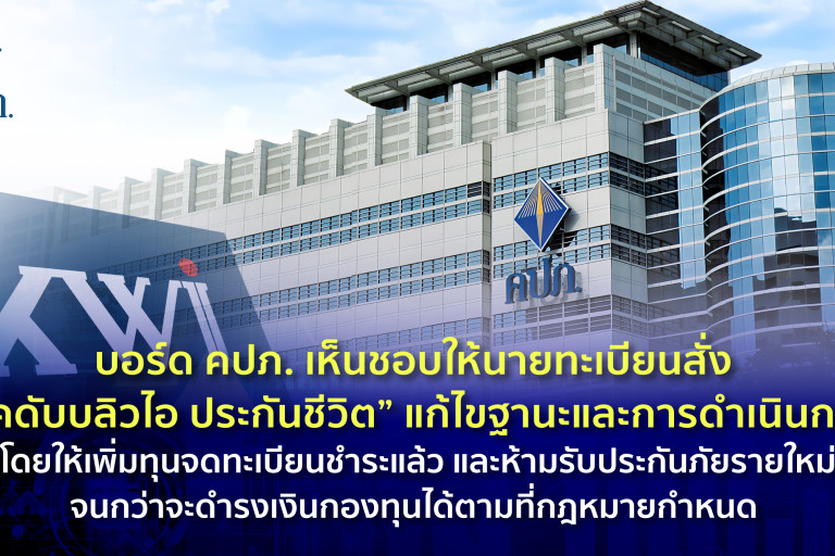 บอร์ด คปภ. เห็นชอบให้นายทะเบียนสั่ง “เคดับบลิวไอ ประกันชีวิต” แก้ไขฐานะและการดำเนินการ โดยให้เพิ่มทุนจดทะเบียนชำระแล้ว และห้ามรับประกันภัยรายใหม่จนกว่าจะดำรงเงินกองทุนได้ตามที่กฎหมายกำหนด
