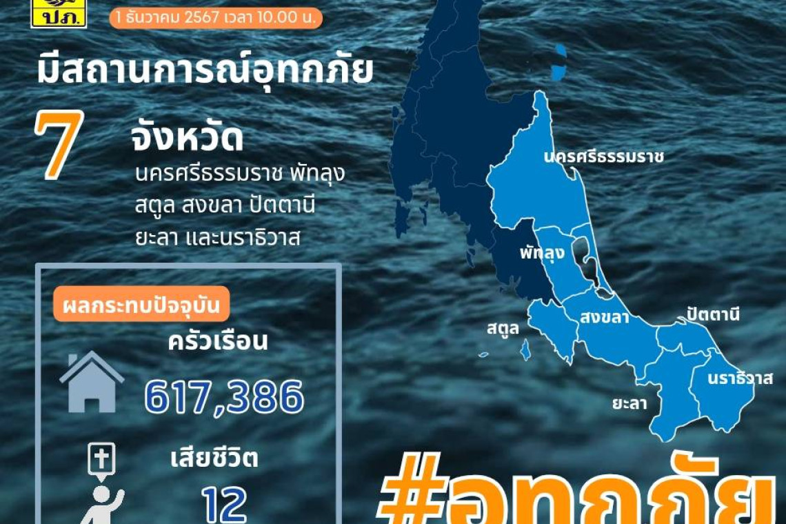 วันที่ 1 ธ.ค. 67 เวลา 10.00 น. ปภ.เผยมีสถานการณ์อุทกภัยในพื้นที่ 7 จังหวัด ได้แก่ นครศรีธรรมราช พัทลุง สตูล สงขลา ปัตตานี ยะลา และนราธิวาส รวม 78 อำเภอ 508 ตำบล 3,387 หมู่บ้าน ประชาชนได้รับผลกระทบ 617,386 ครัวเรือน มีผู้เสียชีวิต 12 ราย เจ้าหน้าที่ชุดปฏิบัติการพร้อมเครื่องจักรกลสาธารณภัยเร่งสูบระบายน้ำออกจากพื้นที่ เร่งช่วยเหลือและบรรเทาความเดือดร้อนของประชาชนที่ได้รับผลกระทบ