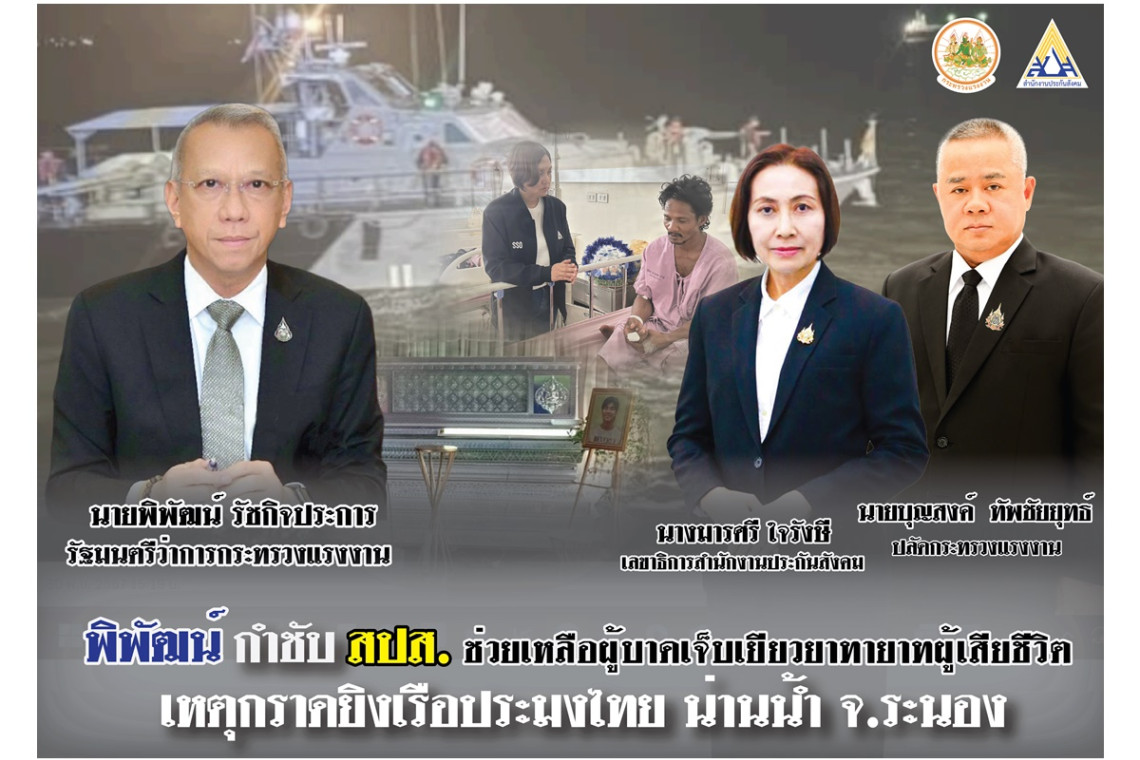 จากกรณีเมื่อวันที่ 30 พฤศจิกายน 2567 ได้เกิดเหตุเรือประมงไทย 3 ลำ ถูกเรือรัฐบาลทหารเมียนมาติดอาวุธ กราดยิงขณะวางอวนล้อมจับปลาในเขตน่านน้ำจังหวัดระนอง อยู่ห่างจากเกาะพยามทางทิศตะวันตกประมาณ 19 กิโลเมตร นายพิพัฒน์ รัชกิจประการ รัฐมนตรีว่าการกระทรวงแรงงาน และนายบุญสงค์ ทัพชัยยุทธ์ ปลัดกระทรวงแรงงาน มีความห่วงใยต่อเหตุการณ์ที่เกิดขึ้น ได้กำชับให้ นางมารศรี ใจรังษี เลขาธิการสำนักงานประกันสังคม เร่งให้ความช่วยเหลือแก่ผู้ได้รับบาดเจ็บและทายาทของผู้เสียชีวิตโดยด่วน
