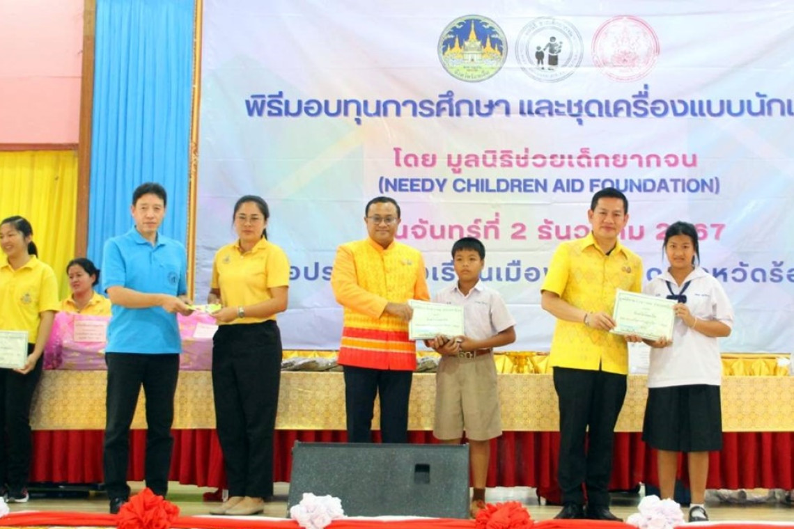 นางวนิดา สมานมิตร พัฒนาสังคมและความมั่นคงของมนุษย์จังหวัดร้อยเอ็ด กล่าวว่า มูลนิธิช่วยเด็กยากจน เป็นองค์กรการกุศลของผู้อุปการะคุณชาวญี่ปุ่นที่นับถือศาสนาเทนรีเคียว ได้ดำเนินการโครงการจัดหาชุดเครื่องแบบนักเรียนและอุปกรณ์การเรียนแก่เด็กยากจน และทุนการศึกษาเพื่อสนับสนุนเป็นค่าเล่าเรียนแก่เด็กนักเรียนอีกส่วนหนึ่ง สำหรับปีการศึกษา พ.ศ. 2567 ได้พิจารณาช่วยเหลือเด็กที่ครอบครัวประสบปัญหาด้านเศรษฐกิจ อยู่ในครัวเรือนเปราะบาง มีความลำบากในการดำรงชีวิต รวม 420 ราย เป็นนักเรียนระดับชั้นมัธยมศึกษาปี 1 - 3 จาก 170 โรงเรียน ครอบคลุมทั้ง 20 อำเภอ ทุกสังกัด ทั้งสำนักงานเขตพื้นที่การศึกษามัธยมศึกษาร้อยเอ็ด สำนักงานเขตพื้นที่การศึกษาประถมศึกษาร้อยเอ็ด เขต 1 เขต 2 เขต 3 และเทศบาลเมืองร้อยเอ็ด ส่วนชุดเครื่องแบบนักเรียนมอบให้นักเรียนระดับประถมศึกษา ในเขตอำเภอโพนทอง จำนวน 600 ชุด ทั้ง 16 โรงเรียน โดยจ้างกลุ่มวิสาหกิจชุมชนบ้านสองห้อง อำเภอโพนทอง จังหวัดร้อยเอ็ด เป็นผู้ตัดเย็บเพื่อเป็นการสร้างรายได้ให้กับชุมชนด้วยอีกทางหนึ่ง