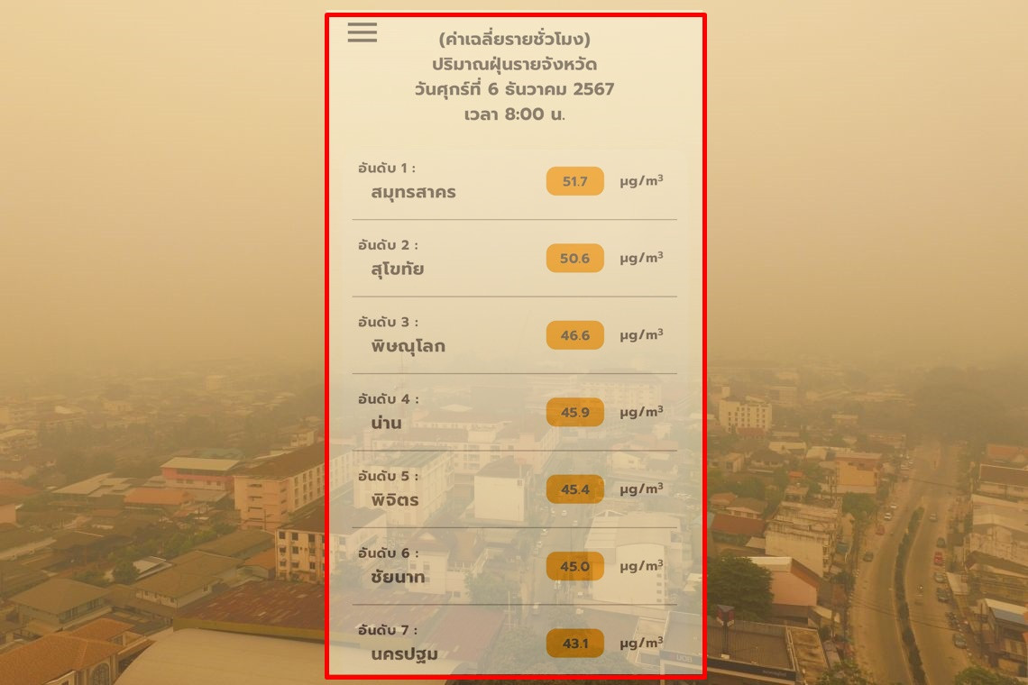 ด้านภาพรวมของประเทศไทยพบ 21 จังหวัด ที่มีค่าฝุ่นในระดับที่เริ่มมีผลต่อสุขภาพและระบบทางเดินหายใจ (สีส้ม) โดยจังหวัดที่มีค่าฝุ่นสูงสุด คือ #สมุทรสาคร 51.7 ไมโครกรัม ในส่วนของจังหวัดอื่นๆ พบค่าคุณภาพอากาศปานกลางไปจนถึงดีมาก