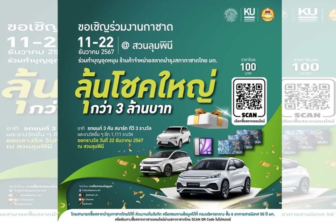 ผู้มีจิตศรัทธาสามารถซื้อสลากบำรุงสภากาชาดไทย ได้ที่งานกาชาด 2567 บูธมหาวิทยาลัยเกษตรศาสตร์ และที่หน่วยงานของมหาวิทยาลัยเกษตรศาสตร์ หรือซื้อสลากทางออนไลน์ได้ที่ : https://www.iredcross.org/raffle/มหาวิทยาลัยเกษตรศาสตร์-sid:349cb9af-fb81-4b07-8fa7-dfd88259cf72 ออกสลากวันที่ 22 ธันวาคม 2567 ณ สวนลุมพินี ผู้ที่ถือสลากที่ถูกรางวัลเท่านั้นที่จะมีสิทธิ์รับรางวัลได้ ตรวจสอบผลรางวัลได้ที่ 1. www.ku.ac.th 2. facebook : Kasetsart Univercity 3. www.iredcross.org ติดต่อรับรางวัลได้ที่ กองบริหารกลาง มหาวิทยาลัยเกษตรศาสตร์ อาคารสารนิเทศ 50 ปี ชั้น 6 เลขที่ 50 ถ.งามวงศ์วาน ลาดยาว จตุจักร กรุงเทพฯ ในวันเเละเวลาราชการ โทรศัพท์ 0 2942 8153 และรับรางวัลภายในวันที่ 21 มีนาคม 2568 หลังจากพ้นกำหนดแล้วถือว่าสละสิทธิ์ในการรับรางวัลและมอบรางวัลนั้นให้สภากาชาดไทย
