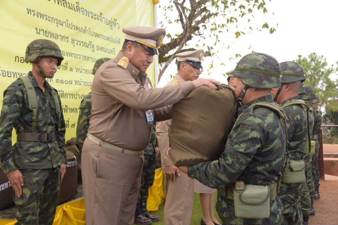 ช่วงบ่าย คณะเดินทางไปยังฐานปฏิบัติการบ้านปางหนุน กองร้อยทหารม้าที่ 1 อำเภอแม่ฟ้าหลวง จังหวัดเชียงราย เชิญถุงพระราชทานจากพระบาทสมเด็จพระเจ้าอยู่หัว และสมเด็จพระนางเจ้า ฯ พระบรมราชินี จำนวน 55 ถุง ไปมอบแก่ผู้ปฏิบัติงานหน่วยงานความมั่นคง จำนวน 6 หน่วยงาน ประกอบด้วย ฐานปฏิบัติการปางหนุน ฐานปฏิบัติการปางหนุน 4 ฐานปฏิบัติการบ้านพญาไพร ฐานปฏิบัติการบ้านแม่หม้อ ฐานปฏิบัติการบ้านแม่หม้อ 1 กองร้อยทหารม้าที่ 1 และฐานปฏิบัติการหัวแม่คำ กองร้อยทหารพรานที่ 3107 เพื่อเป็นขวัญกำลังใจให้แก่เจ้าหน้าที่ในการปฏิบัติหน้าที่ป้องกันประเทศด้วยความเข้มแข็งเสมอมา โอกาสนี้ องคมนตรี ได้เชิญพระราชกระแสทรงห่วงใยจากพระบาทสมเด็จพระเจ้าอยู่หัว และสมเด็จพระนางเจ้า ฯ พระบรมราชินี ไปกล่าวแก่เจ้าหน้าที่ให้ได้รับทราบ สร้างความปลื้มปีติในพระมหากรุณาธิคุณที่ทรงห่วงใยผู้ปฏิบัติงานด้านความมั่นคงเสมอมา