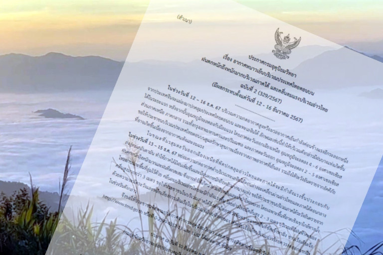 วันที่ 10 ธ.ค.67 กรมอุตุนิยมวิทยา ประกาศฉบับที่ 2 เรื่อง อากาศหนาวเย็นบริเวณประเทศไทยตอนบน ฝนตกหนักถึงหนักมากบริเวณภาคใต้ และคลื่นลมแรงบริเวณอ่าวไทย (มีผลกระทบตั้งแต่วันที่ 12 - 16 ธันวาคม 2567) ความว่า...