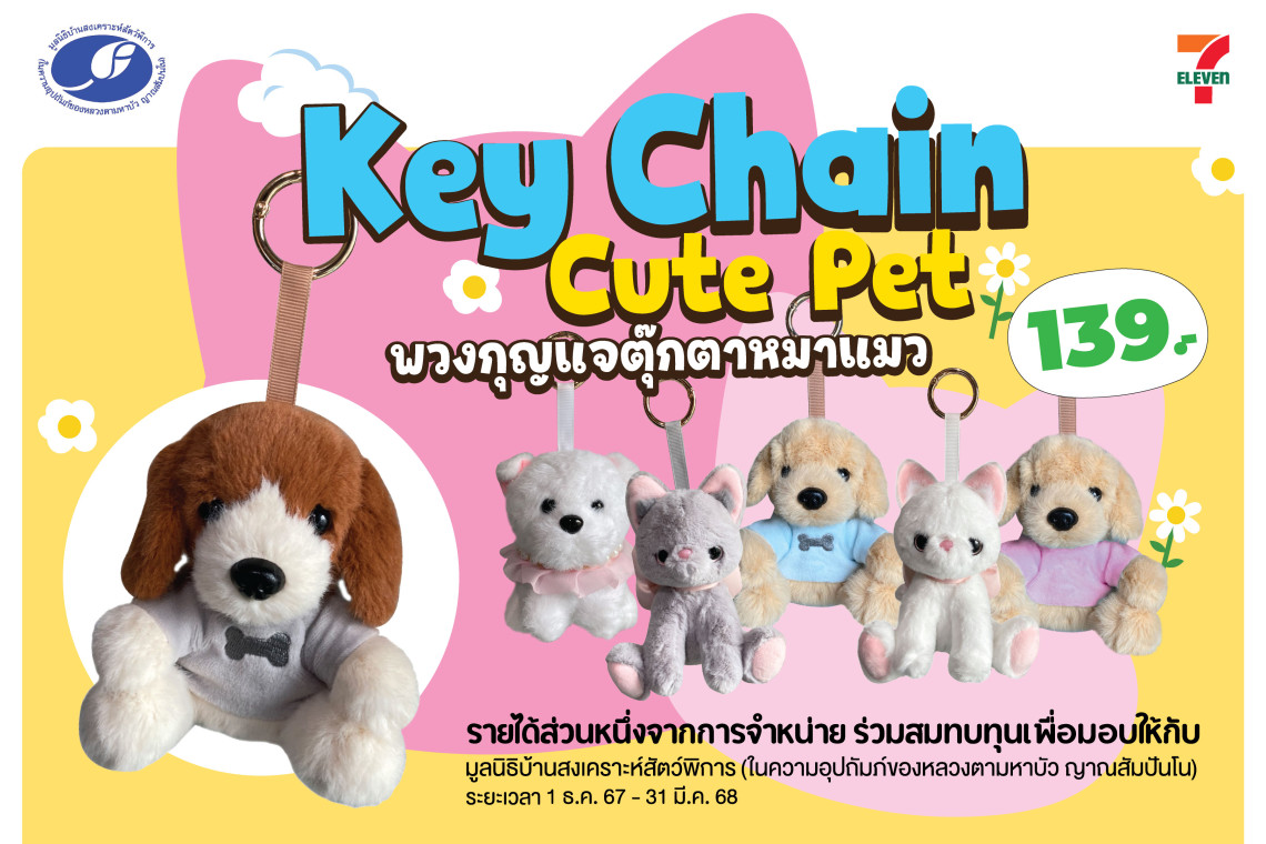 เซเว่น อีเลฟเว่น ยก Box พวงกุญแจน้องหมา น้องแมว ขนนุ่ม น่ารัก มาให้เลือกเป็นจ้าของแล้ววันนี้ เพียงชิ้นละ 139 บาท 1 Box มี 6 กล่อง รายได้ส่วนหนึ่งจากการจำหน่ายจะนำไปมอบให้กับ "มูลนิธิบ้านสงเคราะห์สัตว์พิการ (ในความอุปถัมภ์ของหลวงตามหาบัว ญาณสัมปันโน) เพื่อนำไปช่วยเหลือน้องๆต่อไป
