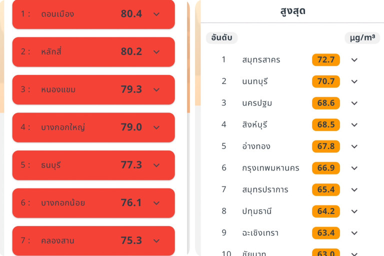 GISTDA เกาะติดสถานการณ์ฝุ่น PM 2.5 ด้วยข้อมูลจากดาวเทียมรายชั่วโมงผ่านแอปพลิเคชั่น “เช็คฝุ่น” (เวลา 8.00 ของวันที่ 11 ธันวาคม 2567) กรุงเทพมหานครพบค่าคุณภาพอากาศเกินเกณฑ์มาตรฐาน โดยพบ 8 เขตพื้นที่ที่มีผลกระทบต่อสุขภาพและระบบทางเดินหายใจ(สีแดง) คือ #ดอนเมือง 80.4 ไมโครกรัม #หลักสี่ 80.2 ไมโครกรัม #หนองแขม 79.3 ไมโครกรัม #บางกอกใหญ่ 79 ไมโครกรัม #ธนบุรี 77.3 ไมโครกรัม #บางกอกน้อย 76.1 ไมโครกรัม #คลองสาน 75.3 ไมโครกรัม #วังทองหลาง 75.1 ไมโครกรัม ในส่วนเขตพื้นที่อื่นๆ พบค่าคุณภาพอากาศที่เริ่มมีผลกระทบต่อสุขภาพ