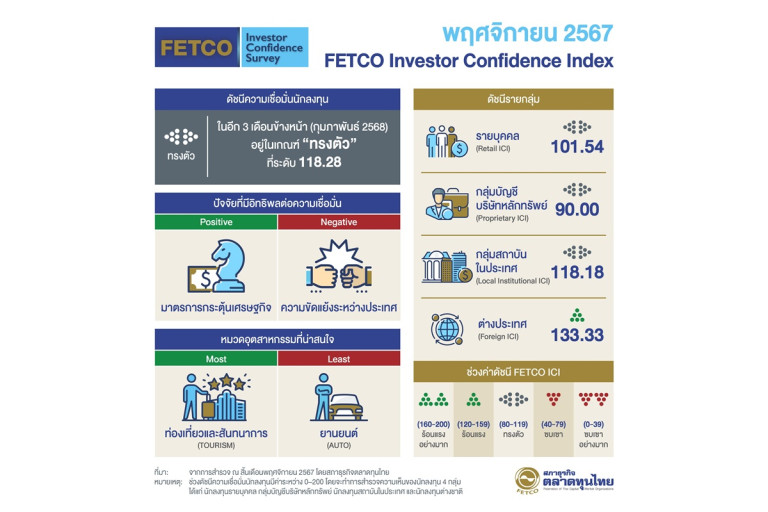 เมื่อวันที่ 11 ธ.ค.67 นายกอบศักดิ์ ภูตระกูล ประธานกรรมการสภาธุรกิจตลาดทุนไทย เปิดเผยดัชนีความเชื่อมั่นนักลงทุน (FETCO Investor Confidence Index) ผลสำรวจในเดือนพฤศจิกายน 2567 (สำรวจระหว่างวันที่ 20-30 พฤศจิกายน 2567) พบว่า “ดัชนีความเชื่อมั่นนักลงทุน (FETCO Investor Confidence Index: ICI) ในอีก 3 เดือนข้างหน้าอยู่ในเกณฑ์ “ทรงตัว” ที่ระดับ 118.28 นักลงทุนมองว่ามาตรการกระตุ้นเศรษฐกิจของภาครัฐ เป็นปัจจัยหนุนความเชื่อมั่นมากที่สุด รองลงมาคือการฟื้นตัวของภาคการท่องเที่ยว และคาดหวังสถานการณ์ขัดแย้งระหว่างประเทศคลี่คลาย ในขณะที่ปัจจัยที่ฉุดความเชื่อมั่นนักลงทุนมากที่สุด ได้แก่ สถานการณ์ความขัดแย้งระหว่างประเทศ การถดถอยของเศรษฐกิจในประเทศ และสถานการณ์เงินเฟ้อ