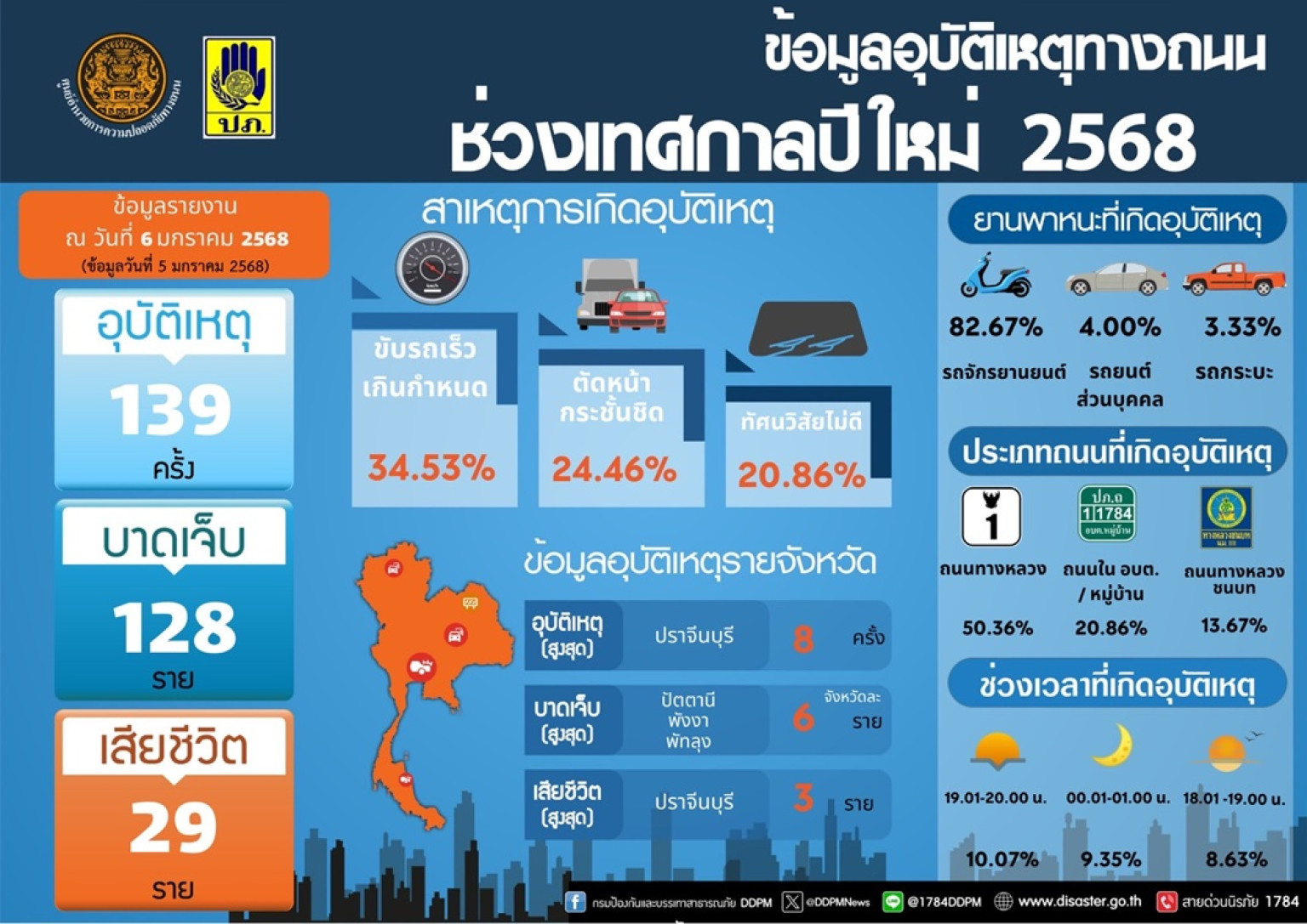 สำหรับข้อมูลอุบัติเหตุทางถนนช่วงเทศกาลปีใหม่ 2568 ประจำวันที่ 5 มกราคม 2568 ซึ่งเป็นวันที่สิบของการรณรงค์ “ขับขี่ปลอดภัย เมืองไทยไร้อุบัติเหตุ” ศูนย์อำนวยการป้องกันและลดอุบัติเหตุทางถนนช่วงเทศกาลปีใหม่ พ.ศ. 2568 โดยกรมป้องกันและบรรเทาสาธารณภัยและความร่วมมือของหน่วยงานภาคีเครือข่ายได้รวบรวมสถิติอุบัติเหตุทางถนนประจำวันที่ 5 มกราคม 2568 เกิดอุบัติเหตุ 139 ครั้ง ผู้บาดเจ็บ 128 คน ผู้เสียชีวิต 29 ราย สาเหตุที่ทำให้เกิดอุบัติเหตุสูงสุด ได้แก่ ขับรถเร็ว ร้อยละ 34.53 ตัดหน้ากระชั้นชิด ร้อยละ 24.46 และทัศนวิสัยไม่ดี ร้อยละ 20.86 ยานพาหนะที่เกิดอุบัติเหตุสูงสุด ได้แก่ รถจักรยานยนต์ ร้อยละ 82.67 ส่วนใหญ่เกิดบนเส้นทางตรง ร้อยละ 85.61 ถนนกรมทางหลวง ร้อยละ 50.36 ถนนใน อบต./หมู่บ้าน ร้อยละ 20.86 ช่วงเวลาที่เกิดอุบัติเหตุสูงสุด ได้แก่ เวลา 19.01-20.00 น. ร้อยละ 10.07 เวลา 00.01-01.00 น. ร้อยละ 9.35 และ เวลา 18.01-19.00 น. ร้อยละ 8.63 ผู้บาดเจ็บและเสียชีวิตสูงสุดอยู่ในช่วงอายุ 50-59 ปี ร้อยละ 18.47 จัดตั้งจุดตรวจหลัก 1,762 จุด เจ้าหน้าที่ปฏิบัติงาน 49,750 คน โดยจังหวัดที่เกิดอุบัติเหตุสูงสุด ได้แก่ ปราจีนบุรี (8 ครั้ง) จังหวัดที่มีผู้บาดเจ็บสูงสุด ได้แก่ ปัตตานี พังงา และพัทลุง (จังหวัดละ 6 คน) จังหวัดที่มีผู้เสียชีวิตสูงสุด ได้แก่ ปราจีนบุรี (จังหวัดละ 3 ราย)