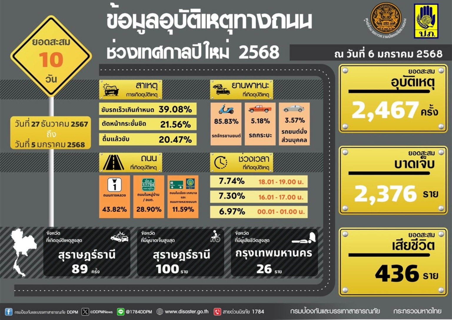 ซึ่งสรุปอุบัติเหตุทางถนนสะสมในช่วง 10 วันของการรณรงค์ (27 ธันวาคม 2567 – 5 มกราคม 2568) เกิดอุบัติเหตุรวม 2,467 ครั้ง ผู้บาดเจ็บรวม 2,376 คน ผู้เสียชีวิต รวม 436 ราย จังหวัดที่เกิดอุบัติเหตุสะสมสูงสุด ได้แก่ สุราษฎร์ธานี (89 ครั้ง) จังหวัดที่มีผู้บาดเจ็บสะสมสูงสุด ได้แก่ สุราษฎร์ธานี (100 คน) จังหวัดที่มีผู้เสียชีวิตสะสมสูงสุด ได้แก่ กรุงเทพมหานคร (26 ราย) และจังหวัดที่ไม่มีผู้เสียชีวิต (ตายเป็นศูนย์) 3 จังหวัด ได้แก่ ตราด ยะลา สมุทรสงคราม