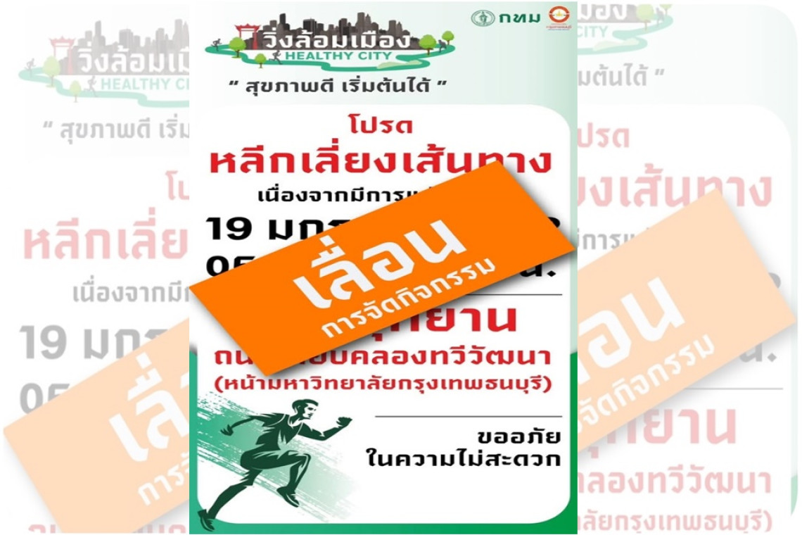 เลื่อนการจัดกิจกรรม #วิ่งล้อมเมือง เนื่องจากปริมาณฝุ่น PM 2.5 ที่เพิ่มขึ้น อาจมีผลกระทบต่อสุขภาพ