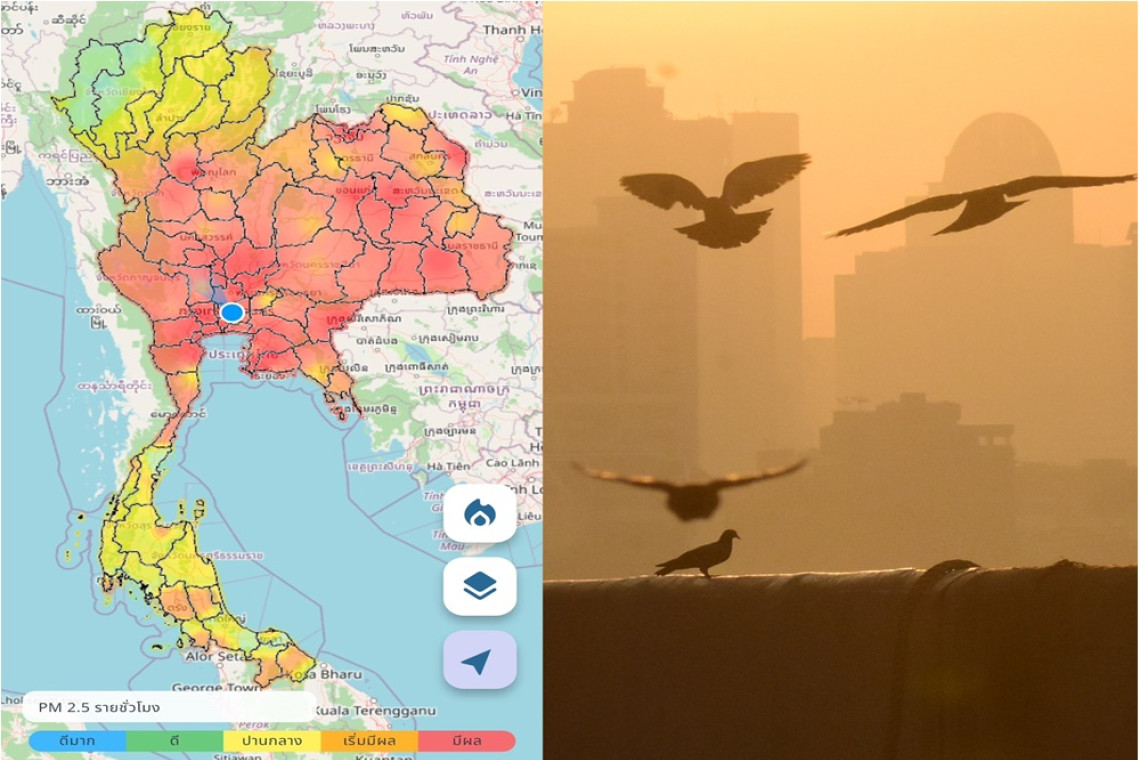 ด้านของภาพรวมประเทศไทยพบค่าฝุ่น PM2.5 ที่ส่งผลกระทบต่อสุขภาพและระบบทางเดินหายใจระดับสีแดง 40 จังหวัด ส่วนใหญ่อยู่ในภาคกลาง และพบค่า PM2.5 เริ่มผลกระทบต่อสุขภาพ (สีส้ม) กระจายอยู่ทั่วทุกภูมิภาค