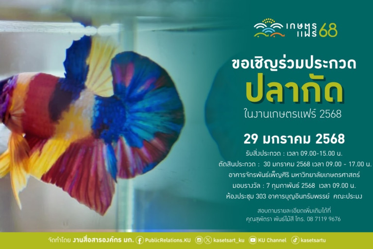 มหาวิทยาลัยเกษตรศาสตร์ จัดงานเกษตรแฟร์ประจำปี 2568 ระหว่างวันที่ 31 ม.ค.-8 ก.พ. 2568 ณ มหาวิทยาลัยเกษตรศาสตร์ โดยในปีนี้ คณะประมง มหาวิทยาลัยเกษตรศาสตร์ จัดการประกวดปลากัดชิงถ้วยพระราชทาน สมเด็จพระเจ้าน้องนางเธอ เจ้าฟ้าจุฬาภรณวลัยลักษณ์ อัครราชกุมารี กรมพระศรีสวางควัฒน วรขัตติยราชนารี เงินรางวัลรวม 270,000 บาท ในงานเกษตรแฟร์ ประจำปี 2568 ณ อาคารจักรพันธ์เพ็ญศิริ มหาวิทยาลัยเกษตรศาสตร์