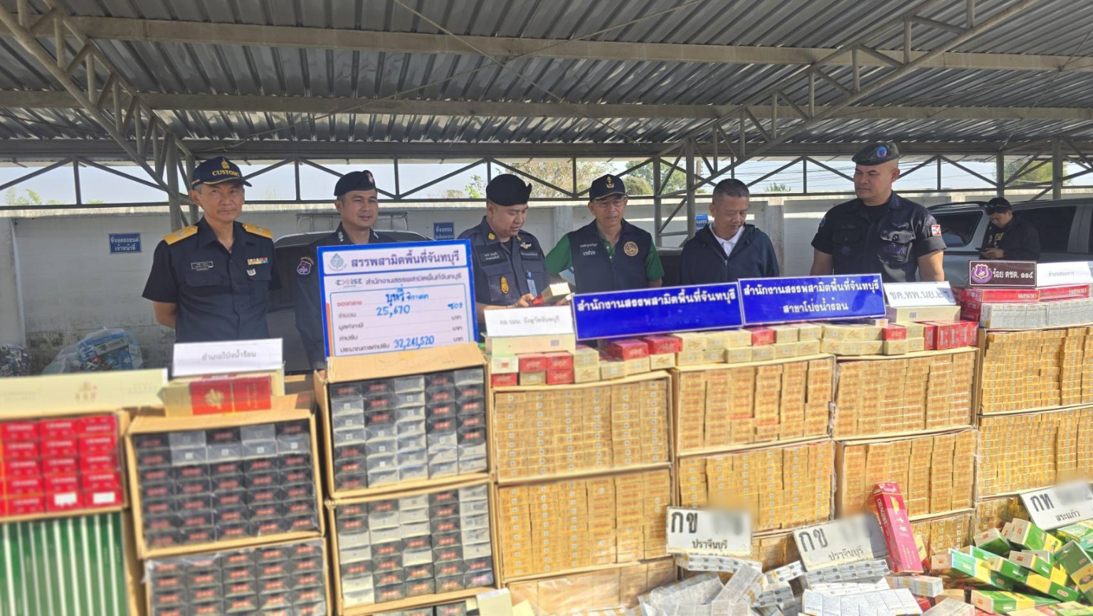 สรรพสามิตจันทบุรี บูรณาการ 9 หน่วยงาน ลุยกวาดล้างทลายเครือข่ายลักลอบขนบุหรี่หนีภาษี ยึดของกลาง 25 ลัง ค่ากว่า 5 ล้านบาท พร้อมรถต้องสงสัย 2 คัน