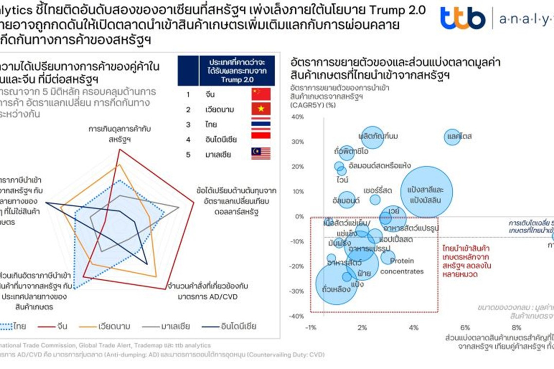 เมื่อวันที่ 24 ม.ค.68 ศูนย์วิเคราะห์เศรษฐกิจ ทีทีบี (ttb analytics) ประเมินว่า ไทยมีความเสี่ยงจะถูกเพ่งเล็งจากมาตรการกีดกันทางการค้าของสหรัฐฯ ภายใต้นโยบาย Trump 2.0 สูงเป็นอันดับที่ 2 ของอาเซียนรองจากเวียดนาม จากการที่สหรัฐฯ เสียเปรียบทางการค้ากับไทยในหลายมิติ ไม่ว่าจะเป็นการเกินดุลการค้าของไทยสูง ข้อได้เปรียบด้านต้นทุนจากการอ่อนค่าของค่าเงินบาท จำนวนคำสั่งมาตรการ AD และ CVD ในหลายประเภทสินค้า (เช่น เหล็กและโลหะ แผงโซลาร์ และเคมีภัณฑ์) สูงกว่าคู่เทียบ รวมถึงการจัดเก็บภาษีนำเข้าสินค้าเกษตรของไทยในอัตราที่ค่อนข้างสูงเมื่อเทียบกับคู่ค้ารายอื่น