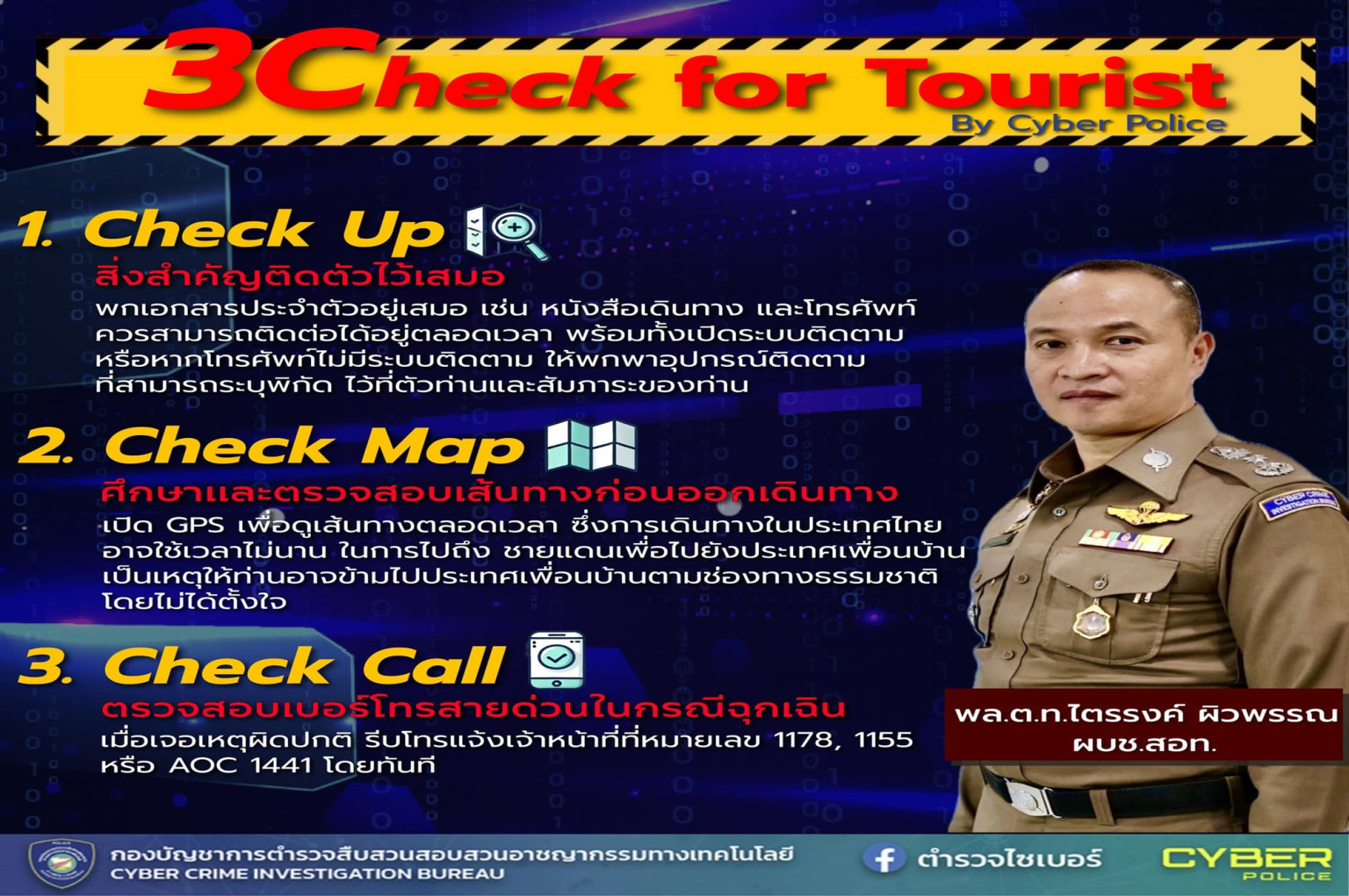 พล.ต.ท.ไตรรงค์ ผิวพรรณ ผู้บัญชาการตำรวจสืบสวนสอบสวนอาชญากรรมทางเทคโนโลยี หรือ ตำรวจไซเบอร์ ฝากความห่วงใยถึงนักท่องเที่ยว “ในปัจจุบันแก๊งมิจฉาชีพ Scam Center มักจะตั้งฐานปฎิบัติการ นอกพื้นที่ชายแดนที่ ติดกับประเทศไทย หากคุณได้รับข้อความหรือโฆษณาชวนเชื่อ ที่เกี่ยวกับการทำงานในประเทศไทย โปรดตรวจสอบข้อมูล ด้วยความระมัดระวังเป็นพิเศษ และเมื่อท่านเดินทางมาถึงประเทศไทย เพื่อความปลอดภัยของท่านไม่ให้ตกเป็นเหยื่อของกลุ่ม Scam Center เมื่อออกเดินทางทุกครั้งโปรดปฏิบัติ 3 Check ดังนี้