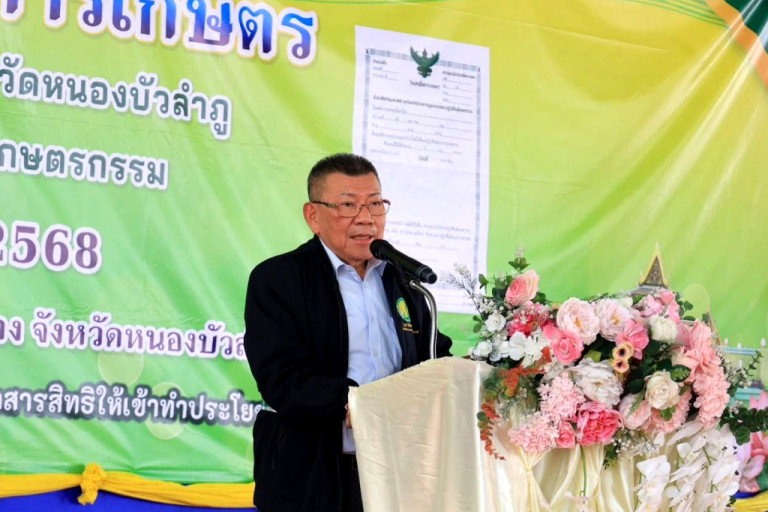 วันที่ 25 ม.ค.68 นายอิทธิ ศิริลัทธยากร รัฐมนตรีช่วยว่าการกระทรวงเกษตรและสหกรณ์ เป็นประธานพิธีมอบโฉนดเพื่อการเกษตร ให้แก่เกษตรกรในเขตปฏิรูปที่ดินจังหวัดหนองบัวลำภู จำนวน 1,125 ราย 1,302 แปลง เนื้อที่ประมาณ 16,636 ไร่ ในพื้นที่ 4 อำเภอ ได้แก่ อำเภอนากลาง อำเภอนาวัง อำเภอศรีบุญเรือง และอำเภอสุวรรณคูหา ณ โรงเรียนคำแสนวิทยาสรรค์ อำเภอนากลาง จังหวัดหนองบัวลำภู เพื่อให้เกษตรกรสามารถนำไปต่อยอดในการเข้าถึงโอกาสการให้บริการของภาครัฐ โอกาสการเข้าถึงแหล่งเงินทุนได้เพิ่มมากขึ้น เกษตรกรได้มีทางเลือกในการพัฒนาที่ดินและพัฒนาอาชีพของตนเอง เพื่อสร้างคุณภาพชีวิตที่ดีขึ้นอย่างยั่งยืน