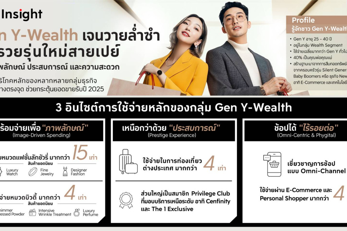 The 1 Insight ชี้ทางธุรกิจปลุกยอดขายรับปี 2025 เผยกลยุทธ์เจาะกลุ่มผู้บริโภค “Gen Y-Wealth เจนวายล่ำซำ” ซึ่งก็คือกลุ่ม Gen Y (อายุ 25-40 ปี) ที่อยู่ใน Wealth Segment ของประเทศไทย โดยกลุ่ม Gen Y-Wealth มีการใช้จ่ายสูงกว่า 7 เท่าเมื่อเทียบกับ Gen Y ทั่วไป จึงเป็นลูกค้า High Value และ Premium Consumers อันเป็นโอกาสทองสำหรับหลากหลายกลุ่มธุรกิจในปัจจุบันและอีกหลายทศวรรษต่อจากนี้ ทั้งนี้ รายงานยังเผย 3 อินไซต์หลักที่มีอิทธิพลต่อการตัดสินใจใช้จ่ายของกลุ่ม Gen Y-Wealth ได้แก่ 1) พร้อมจ่ายเพื่อ “ภาพลักษณ์” (Image-Driven Spending) โดยเฉพาะในหมวดแฟชั่นลักชัวรี่และบิวตี้ 2) เหนือระดับด้วย “ประสบการณ์” (Prestige Experience) มากกว่าเพียงการซื้อสินค้า และ 3) ช้อปได้ “ไร้รอยต่อ” (Omni-Centric & Phygital) เน้นความสะดวกสบาย ไร้ข้อจำกัด