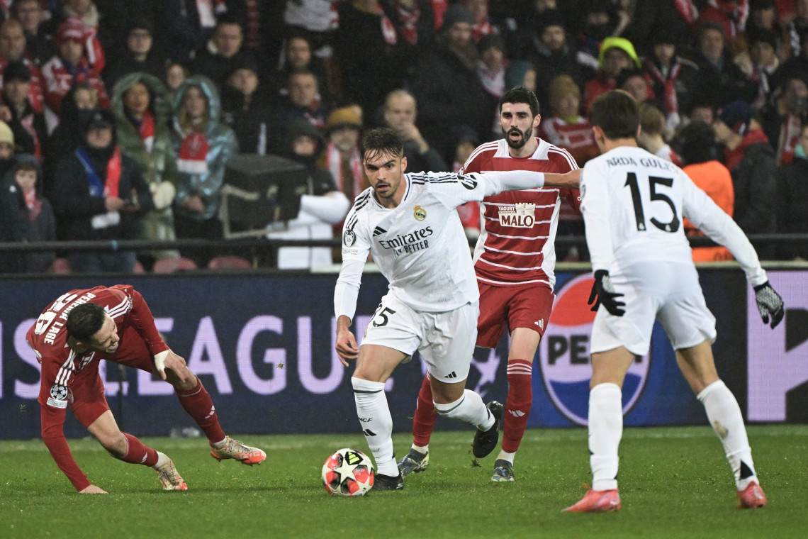 ที่สนาม สต๊าด ดู รูดูรู ประเทศฝรั่งเศส ในการแข่งขันฟุตบอลยูฟ่า แชมเปี้ยนส์ ลีก รอบลีกเฟส คืนวันที่ 29 ม.ค.68 ระหว่างทีม "แบรสต์" พบกับทีม "เรอัล มาดริด" เริ่มเกมการแข่งขัน นาทีที่ 27 ราชันออกนำ 1-0 จังหวะนี้ โรดรีโก้ เลี้ยงหนีแนวรับเจ้าบ้านก่อนยิงด้วยซ้ายผ่านมือ บิซ็อท ชนเสาแล้วเด้งเข้าประตูไป