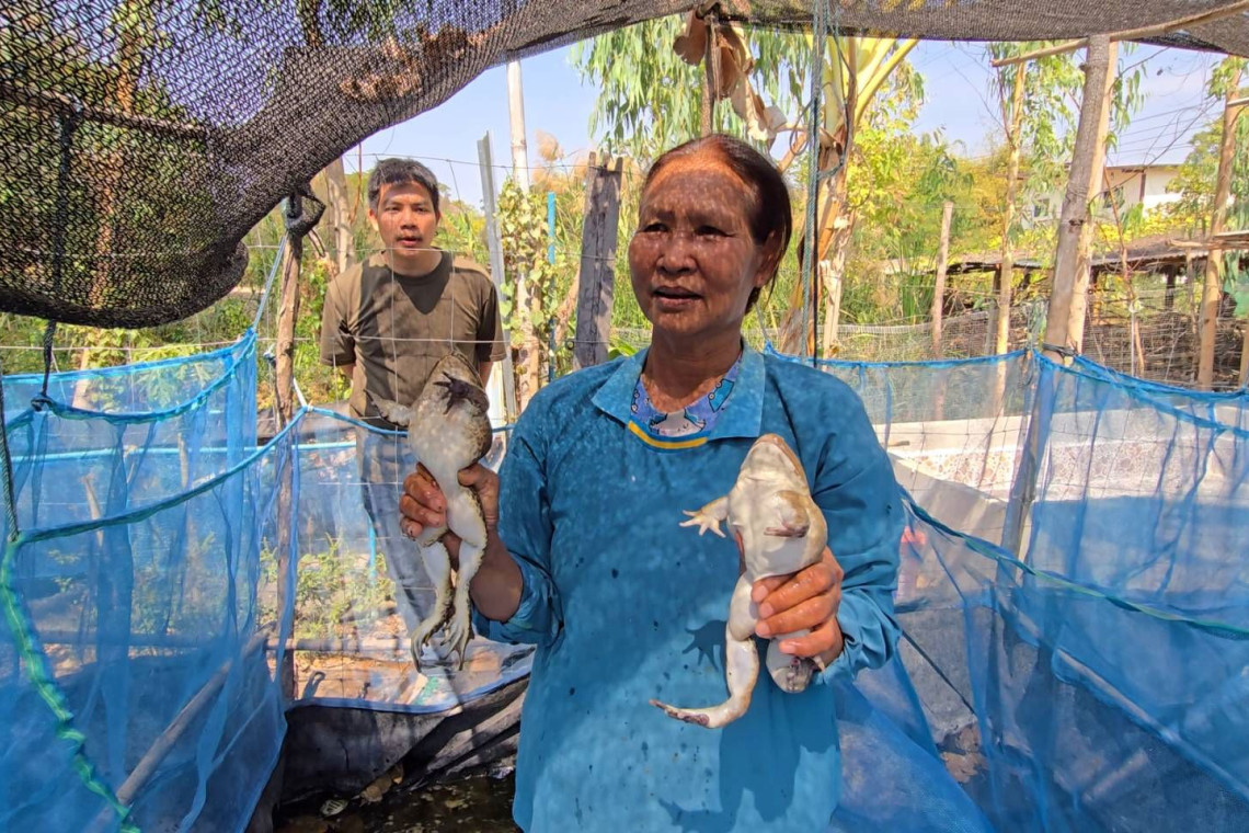 วันที่ 30 ม.ค. 2568 เวลา 12.00 น.ผู้สื่อข่าวรายงาน ว่า ที่ฟาร์มกบแม่พลอย ตั้งอยู่ริมคลองชลประทาน ไม่มีเลขที่ ซึ่งตั้งอยู่ในเขต ต.พระลับ อ.เมือง จ.ขอนแก่น นางพลอย อุดมพันธ์ อายุ 58 ปี เจ้าของฟาร์มกบแม่พลอย กำลังเดินสำรวจบ่อกบที่เลี้ยงไว้ภายในฟาร์มกว่า 20 บ่อ เนื่องจากสภาพอากาศที่หนาวเย็นในช่วงนี้ อุณหภูมิต่ำสุดอยู่ที่ 12 - 14 องศาเซลเซียส ซึ่งส่งผลให้กบที่เลี้ยงไว้ในฟาร์มโดยเฉพาะพ่อพันธุ์แม่พันธุ์ ทุนสภาพอากาศที่หนาวเย็นไม่ไหว เกิดการช็อกแข็งตายอยู่ภายน้ำ เนื่องจากน้ำอุณหภูมิลดลงตามไปด้วย ซึ่งจะต้องมีการหมั่นดูแลอยู่เรื่อยเรื่อยเพื่อทำการเติมน้ำเข้าบ่อปรับอุณหภูมิไม่ให้หนาวเย็นจนเกินไป ซึ่งเจ้าของฟาร์มบอกว่าในปีนี้มีกบตายไปแล้วกว่า 10 ตัว แต่ปีที่ผ่านมาไม่หนาวเท่าปีนี้ไม่ได้มีกบตายแต่อย่างใด