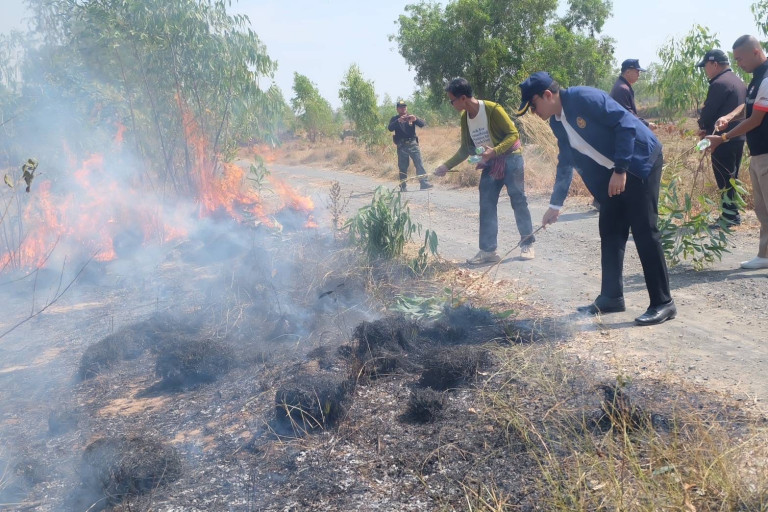 นอภ.เมืองศรีสะเกษ รุดตรวจสอบเหตุไฟไหม้ทุ่งลุกลามพื้นที่กว่า 300 ไร่ เร่งฉีดน้ำสะกัดเพลิงระงับฝุ่น PM 2.5