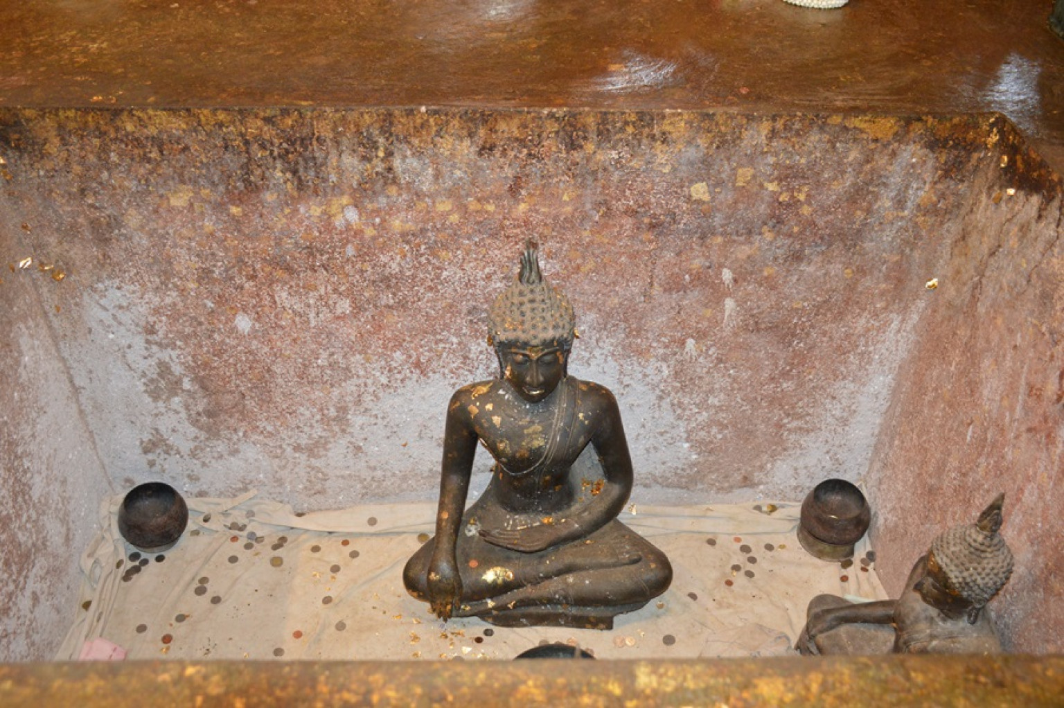 สำหรับ พระแท่นศิลาอาสน์ เป็นแท่นศิลาแลง มีขนาดกว้าง 8 ฟุต ยาว 9 ฟุต สูง 3 ฟุต เป็นปูชนียวัตถุที่มีตำนานกล่าวว่า เป็นแท่นที่พระโพธิสัตว์ 5 พระองค์ เมื่อครั้งเสวยชาติเป็นเดรัจฉาน เสด็จมาประทับเพื่อบำเพ็ญพระบารมี ตั้งสัตยาธิษฐานเพื่อปรารถนาที่จะตรัสรู้เป็นพระพุทธจ้า ในภัทรกัปเดียวกันนี้ ต่อมาพระโพธิสัตว์ทั้ง 5 พระองค์ ได้ตรัสรู้เป็นพระพุทธเจ้าไปแล้ว 4 พระองค์ คือ พระกกุกสันโทพุทธเจ้า พระโกนาคมโนพุทธเจ้า พระกัสโปพุทธเจ้า และพระโคตโมพุทธเข้า ส่วนพระโพธิสัตว์องค์ที่ 5 คือ พระศรีอาริยเมตไตโยโพธิสัตว์ จะเสด็จมาตรัสรู้เป็นพระพุทธเจ้าองค์ต่อไป เมื่ออายุกาลพระพุทธศาสนาของพระพุทธเจ้าองค์ ปัจจุบันล่วงพ้นมาแล้วกว่า 5,000 ปี