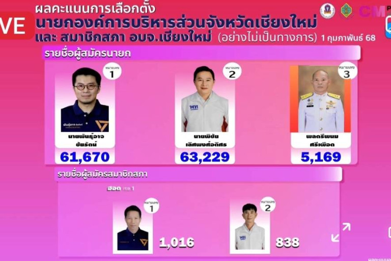 วันที่ 1 ก.พ.2568 ผู้สื่อข่าวรายงานว่า การเลือกตั้งนายกองค์การบริหารส่วนจังหวัด (นายก อบจ.) และสมาชิกสภาองค์การบริหารส่วนจังหวัด (ส.อบจ.) การเลือกตั้งทั่วประเทศ ตั้งแต่เวลา 08.00-17.00 น. ได้มีการปิดหีบเลือกตั้งไปแล้วนั้น ในส่วนของ นายก อบจ. ที่น่าสนใจอย่างจ.เชียงใหม่ มีผู้สมคร 3 รายประกอบด้วย หมายเลข 1 นายพันธุ์อาจ ชัยรัตน์ จากพรรคประชาชน หมายเลข 2 นายพิชัย เลิศพงศ์อดิศร จากพรรคเพื่อไทย และ หมายเลข 3 พล.ต.พนม ศรีเผือด