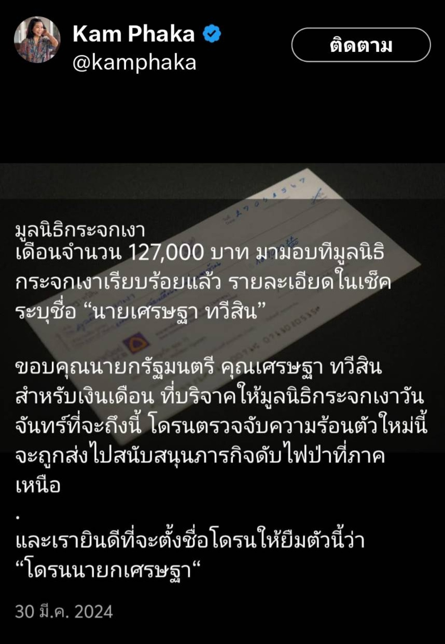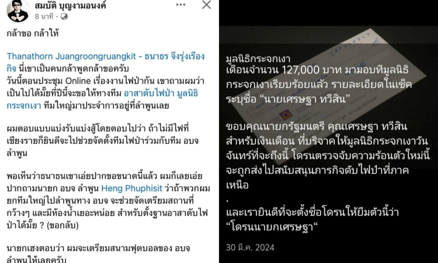 สมัยนายกฯ เศรษฐา บริจาคเงินเดือนนายกฯ ให้มูลนิธิกระจกเงาไปซื้ออุปกรณ์ดับไฟป่า