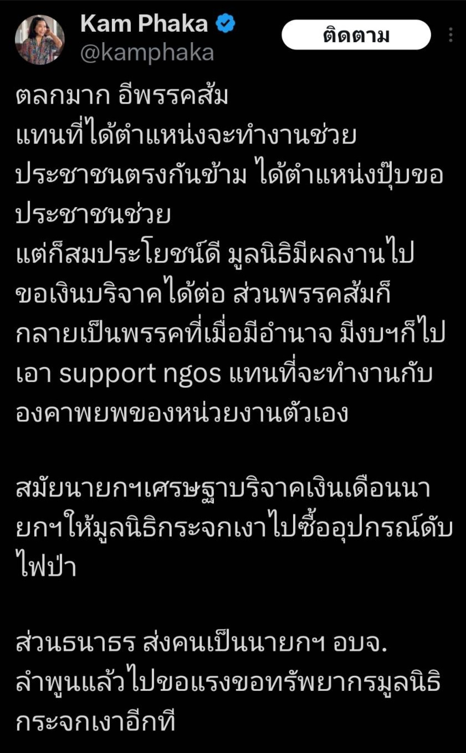 แต่ก็สมประโยชน์ดี มูลนิธิมีผลงานไปขอเงินบริจาคได้ต่อ ส่วนพรรคส้มก็กลายเป็นพรรคที่เมื่อมีอำนาจ มีงบฯ ก็ไปเอา support ngos แทนที่จะทำงานกับองคาพยพของหน่วยงานตัวเอง