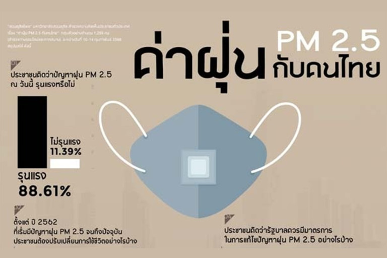 ผู้ช่วยศาสตราจารย์ ดร.สมศักดิ์ เจริญพูล หัวหน้าศูนย์พัฒนาเครือข่ายความร่วมมือทางวิชาการด้านกฏหมายและการเมือง มหาวิทยาลัยสวนดุสิต อธิบายว่าฝุ่น PM 2.5 ยังคงเป็นปัญหาสำคัญที่ส่งผลกระทบต่อคนไทย ไม่ว่าจะเป็นสุขภาพ ค่าใช้จ่าย หรือวิถีชีวิต ขณะเดียวกัน ภาครัฐยังคงถูกมองว่าไม่สามารถแก้ไขปัญหาได้อย่างมีประสิทธิภาพ แม้ประชาชนจะมีความกังวลว่าการแก้ปัญหาอาจเป็นเรื่องยาก แต่เสียงสะท้อนของคนส่วนใหญ่ชี้ให้เห็นว่ามาตรการที่เหมาะสม เช่น การควบคุมการเผาอย่างเข้มงวด การผลักดันกฎหมายอากาศสะอาดอาจเป็นกุญแจสำคัญในการลดผลกระทบในอนาคต การแก้ไขปัญหาฝุ่น PM 2.5 จึงไม่ใช่เพียงแค่เรื่องของภาครัฐเท่านั้น แต่ยังต้องอาศัยความร่วมมือจากทุกภาคส่วน เพราะอากาศที่สะอาด คือสิทธิขั้นพื้นฐานของทุกคน ทั้งนี้ในช่วงปี 2013 เมืองปักกิ่ง ประเทศจีนก็ประสบปัญหาไม่ต่างจากประเทศไทยในขณะนี้ แต่ประเทศจีนใช้เวลาเพียง 10 ปี ในการแก้ไขปัญหาอย่างเป็นระบบ จัดตั้งหน่วยงานขึ้นมารับผิดชอบโดยตรง ออกแผนควบคุมมลพิษทางอากาศและบังคับใช้อย่างเข้มงวด รวมทั้งติดตามผลลัพธ์อย่างต่อเนื่อง ซึ่งอาจเป็นแนวทางที่ดีในการแก้ไขปัญหา ฝุ่น PM 2.5 ของประเทศไทยในระยะยาว