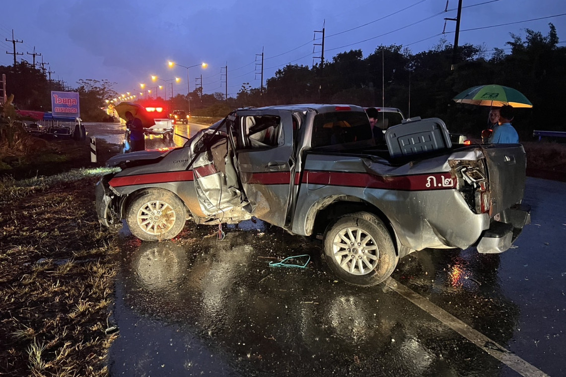 เมื่อเจ้าหน้าที่เดินทางไปถึง พบรถยนต์กระบะ อีซูซุ 4 ประตู เป็นตำรวจ หมายเลขทะเบียน 295xx ข้างรถมีสติเกอร์ข้อความ ภ.2 หมายถึง สังกัดตำรวจภูธรภาค 2 ส่วนคนขับชื่อ จ.ส.ต.เอกพจน์ อายุ 37 ปี ตำรวจสังกัดตำรวจภูธรภาค 2 บาดเจ็บเป็นถลอกตามร่างกาย เจ็บหลัง และมีอาการจุก โดยกู้ภัยหลักเกาะจังหวัดตราด ได้ปฐมพยาบาลเบื้องต้นก่อนนำตัวส่งโรงพยาบาลตราด นอกจากนี้ยังพบเสาไฟฟ้าส่องสว่างบริเวณเกาะกลางถนนโค่นเสียหาย 1 ต้น