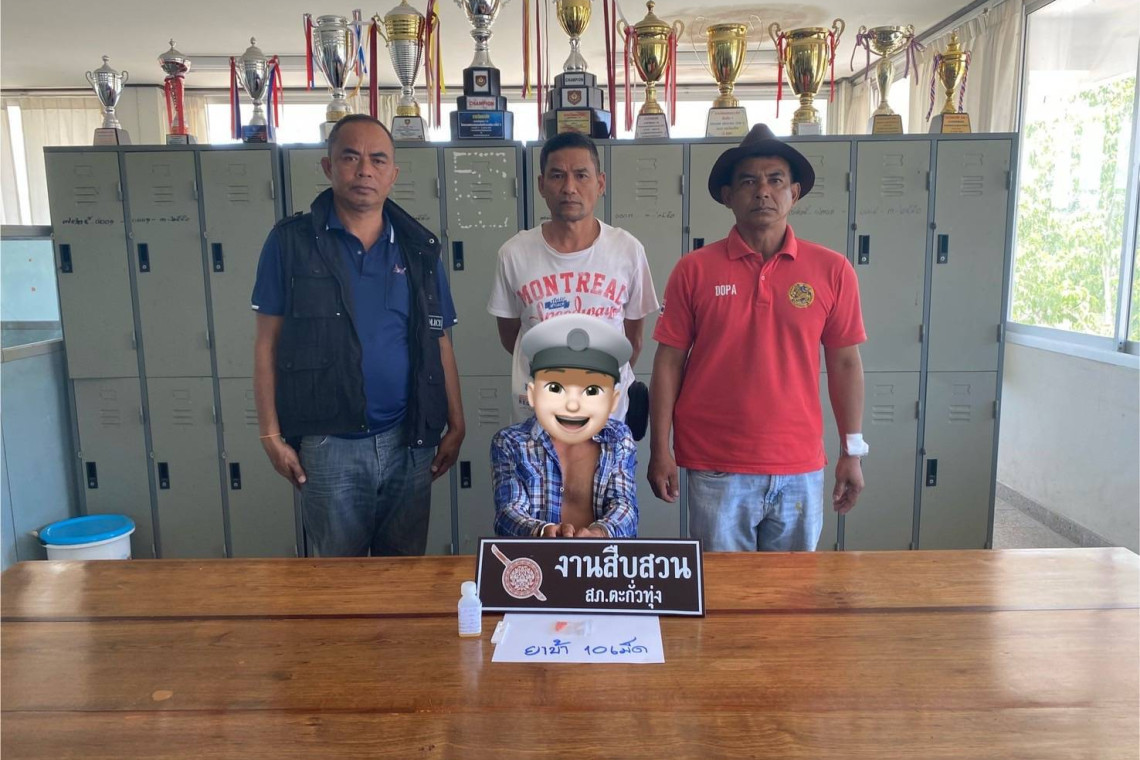 ตำรวจสืบฯตะกั่วทุ่ง ร่วมกับผู้ใหญ่บ้านดักชุ่มผู้ต้องหาข้างถนน พบยาบ้า 10 เม็ด