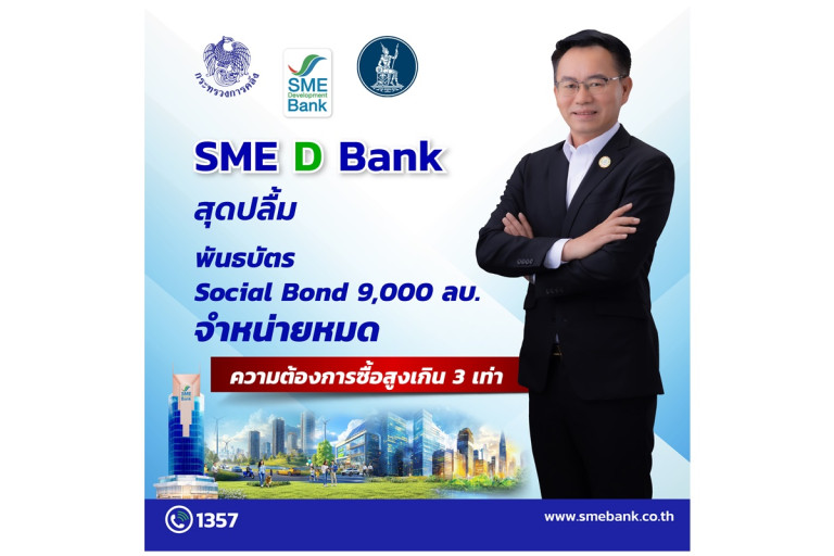 SME D Bank สุดปลื้ม Social Bond 9,000 ล้านบาทจำหน่ายหมด ความต้องการซื้อสูงเกิน 3 เท่า นักลงทุนเชื่อมั่นพร้อมสนับสนุนเอสเอ็มอีเข้าถึงสินเชื่อดอกเบี้ยต่ำ ยกระดับธุรกิจสร้างสังคมที่เป็นสุข