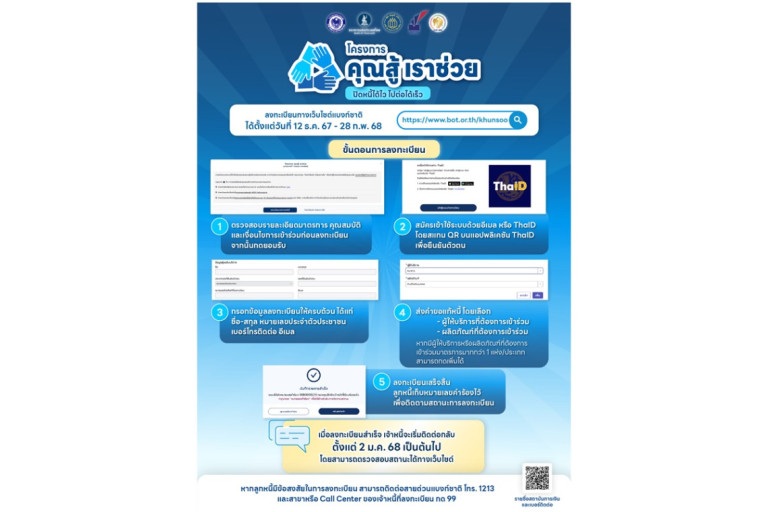 สำหรับ ธปท.ได้ปรับแนวทางดำเนินการ โดยขยายระยะเวลาลงทะเบียนเข้าร่วมโครงการถึงวันที่ 30 เม.ย.68 และเปิดตัวมาตรการให้ความช่วยเหลือลูกหนี้รายย่อยของ Non-bank ที่ไม่ใช่บริษัทในกลุ่มขอธนาคารพาณิชย์ ซึ่งเปิดลงทะเบียนตั้งแต่ 13 ก.พ.-30 เม.ย.68 และให้สถาบันการเงินทุกแห่งแจ้งลูกหนี้ที่มีคุณสมบัติเข้าร่วมมาตรการได้ทุกรายให้เข้ามาลงทะเบียนแล้ว ขอให้ลูกหนี้รับการติดต่อจากเจ้าหนี้ โดยสื่อสารเพื่อแก้ความเข้าใจผิดของลูกหนี้ต่อโครงการลูกหนี้ยังมีสภาพคล่องส่วนเพิ่มจากคำงวดที่ลดลง โดยไม่มีภาระดอกเบี้ยเพิ่มเติม และยังสามารถกู้เพื่อประกอบธุรกิจได้