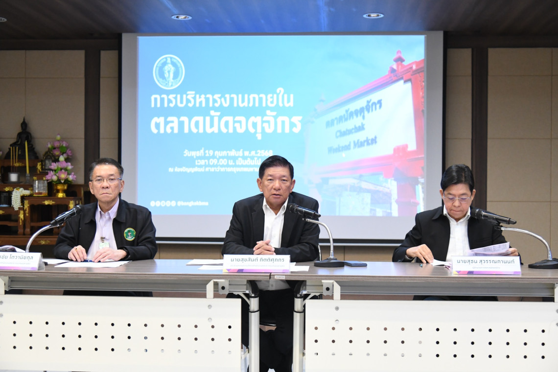 เมื่อวันที่ 19 ก.พ.68 นายสุขสันต์ กิตติศุภกร ประธานกรรมการบริหารสำนักงานตลาดกรุงเทพมหานคร เป็นประธานการแถลงข่าว การบริหารงานภายในตลาดนัดจตุจักร ในประเด็นความโปร่งใสในการบริหารจัดการ การยกเลิกสิทธิแผงค้าและค่าปรับ รวมถึงแนวทางการบริหารพื้นที่และการพัฒนาตลาดเพื่อแก้ไขปัญหาระยะสั้นและระยะยาวโดยมีผู้บริหารสำนักงานตลาดกรุงเทพมหานคร ผู้บริหารตลาดนัดจตุจักร ร่วมแถลงข่าว ณ ห้องปัญญพัฒน์ ชั้น 4 ศาลาว่าการกรุงเทพมหานคร (เสาชิงช้า) เขตพระนคร