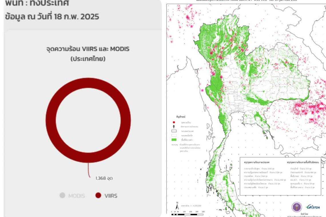 กระทรวง อว. โดย GISTDA เผยข้อมูลจากดาวเทียมซูโอมิ เอ็นพีพี (Suomi NPP) ระบบ VIIRS และจากข้อมูลดาวเทียมดวงอื่นๆ ของเมื่อวันที่ 18 กุมภาพันธ์ 2568 พบว่าประเทศไทยมีจุดความร้อนรวม 1,368 จุด ทั้งนี้ ข้อมูลจากดาวเทียมระบุว่าจุดความร้อนในประเทศไทยเกิดขึ้นในพื้นที่ป่าอนุรักษ์ 559 จุด พื้นที่ป่าสงวนแห่งชาติ 464 จุด พื้นที่เกษตร 139 จุด พื้นที่เขต สปก. 135 จุด พื้นที่ชุมชนและพื้นที่อื่นๆ 69 จุด และพื้นที่ริมทางหลวง 2 จุด