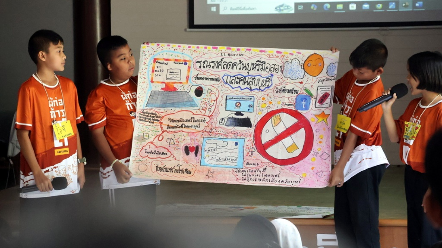 ส่วน ด.ญ.สาวิตรี หนูทอง หรือ เบล ชั้นป.5 โรงเรียนบ้านหินเพิง เล่าว่า “ที่บ้านไม่มีใครสูบบุหรี่ไฟฟ้า แต่ที่โรงเรียนเห็นเพื่อนสองสามคนพกบุหรี่ไฟฟ้ามาโรงเรียนด้วย ก็เคยเตือนว่ามันไม่ดีต่อสุขภาพ และคุณครูจะลงโทษ จากนี้ไปก็จะนำความรู้ที่ได้ ไปขยายผล เพื่อชวนให้เพื่อนเลิกบุหรี่”