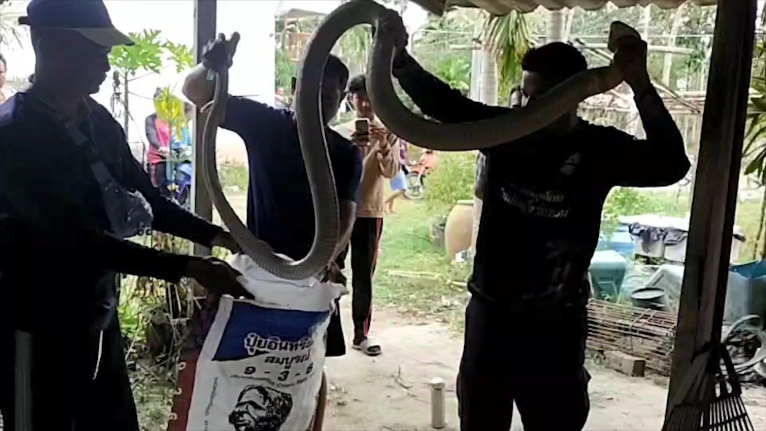 หลังจากนายทวีศักดิ์ฯ ได้รับการประสานจึงพร้อมด้วย กู้ชีพ อบต.สะท้อน รีบนำอุปกรณ์ในการจับงูจงอาง รุดเข้าตรวจสอบทันที เมื่อเจ้าหน้าที่ไปถึงพบจงอางยักษ์ นอนขดตัวอยู่ในโพรงใต้พื้นบ้านดังกล่าว จึงนำตะขอเกี้ยวในการจับงูเข้าทำการจับทันที  ในขณะเข้าจับจงอางยักษ์ ก็ชูคอสูงฉกสู้อย่างดุร้าย  แต่ก็ใช้เวลาไม่นานนักก็สามารถจับงูจงอางยักษ์เอาไว้ได้ นำมาวัดได้ความยาวถึง 4 เมตร แล้วรีบนำใส่กระสอบเพื่อเตรียมนำไปปล่อยคืนสู่ป่าธรรมชาติที่อยู่ห่างไกลบ้านเรือนผู้คนต่อไปเพื่อความปลอดภัย โดยบรรดาไทยมุงที่มายืนดูการจับงูจงอาง ต่างก็พากันเอาบ้านเลขที่มาเป็นเลขเด็ดหวยรัฐบาลงวดนี้ ได้แก่เลข 336 633 363